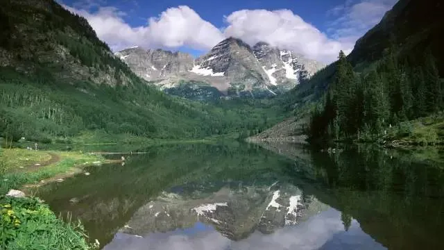 ,雪山冰峰、草地无垠,蓝天白云倒映在河水中,构成了让人心旷神怡的美景。