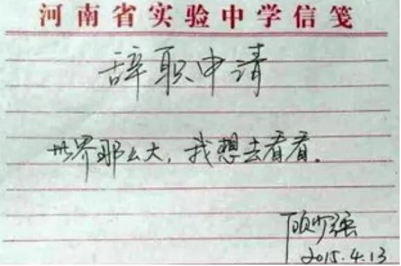 2015年,一位名为顾少强的中学女教师,以简短10字辞职信火遍网络,被誉为“史上最有情怀”的辞职信。