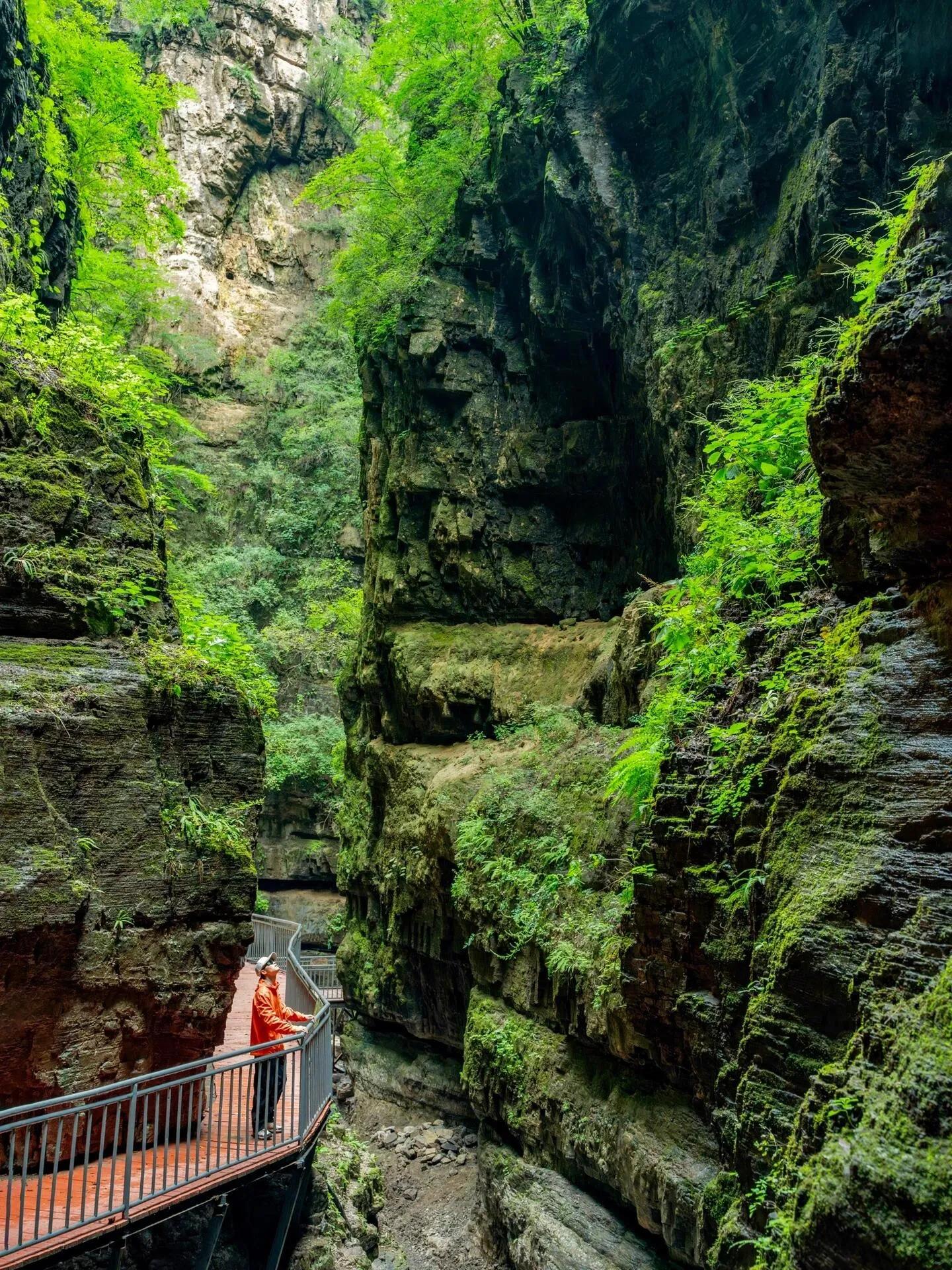 这里就像一个全开放的天然氧吧 。 抬头能够看见峡谷中间露出的明亮天空 ,感受“寄蜉蝣于天地,渺沧海之一粟”的宿命感。放眼望去,身心都开阔了许多。近期实拍的照片证实, 这里不愧是京郊徒步的天花板 。