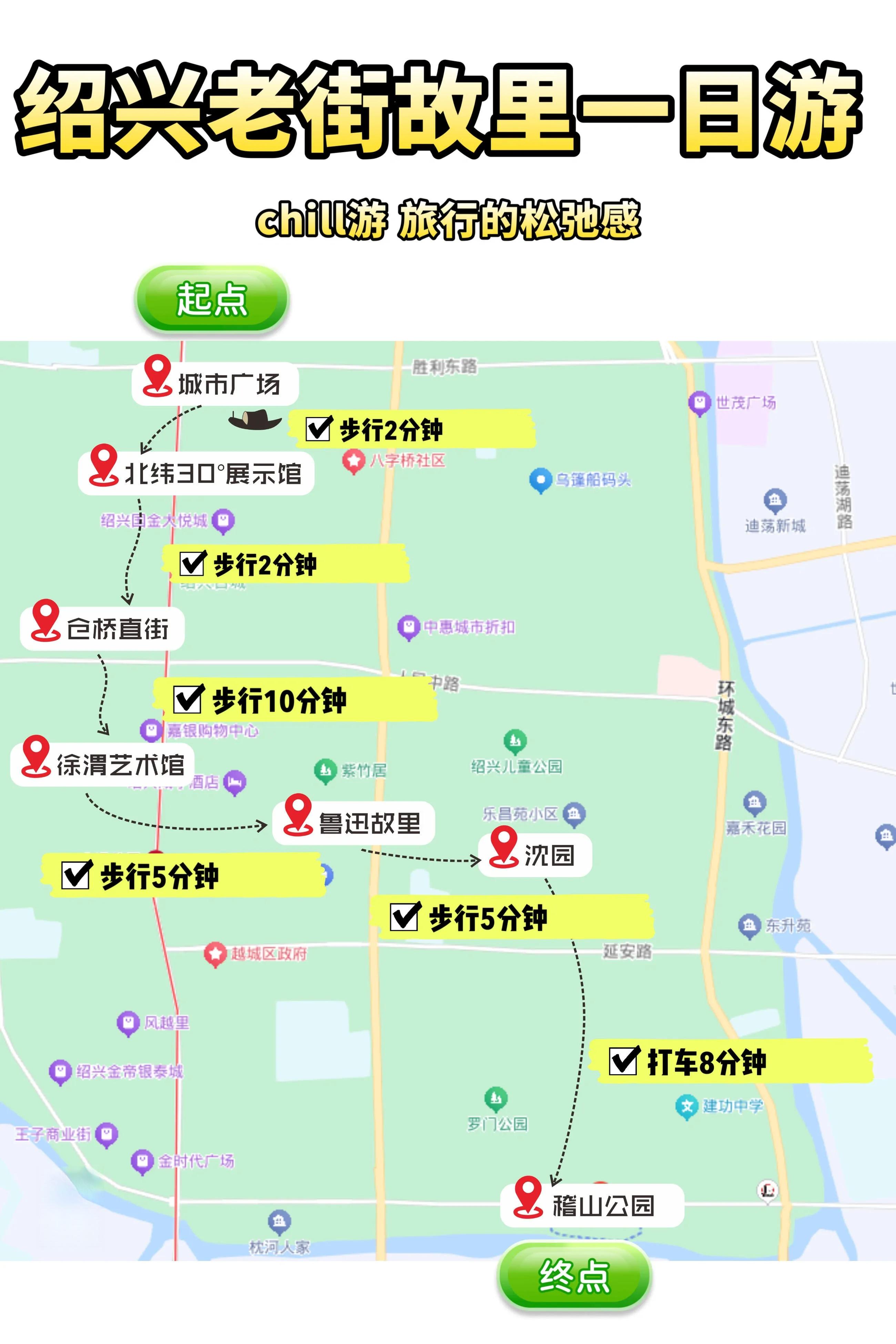 城市广场 → 北纬30°展示馆 → 水乡乌篷 → 仓桥直街 → 徐渭艺术馆 → 鲁迅故里 → 沈园 → 稽山公园