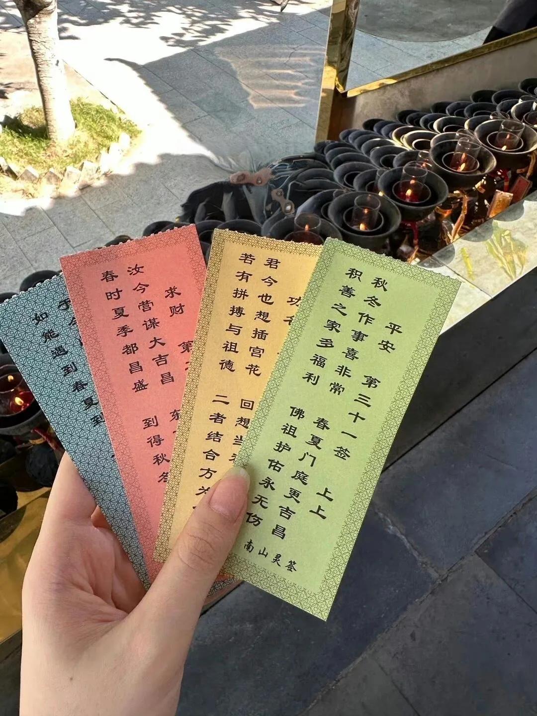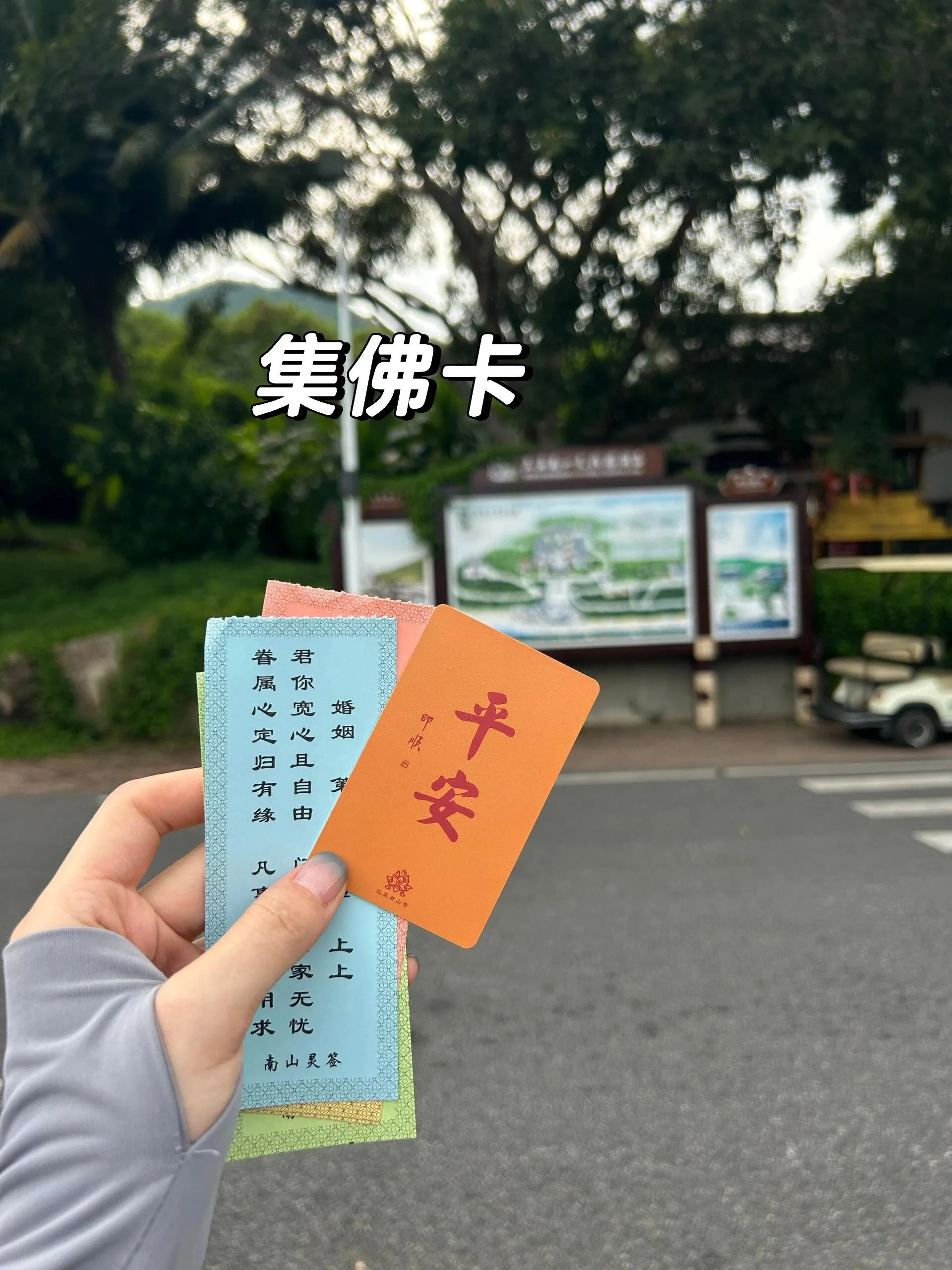 乘坐游览车前往三十三观音堂,可以免费抄经祈福。南山别院可以求签解签,财神殿可以拜财神。南山寺是必去的精华景点,扫码还能领取佛卡。最后可以到长寿谷散步,欣赏植物,爬山健身。