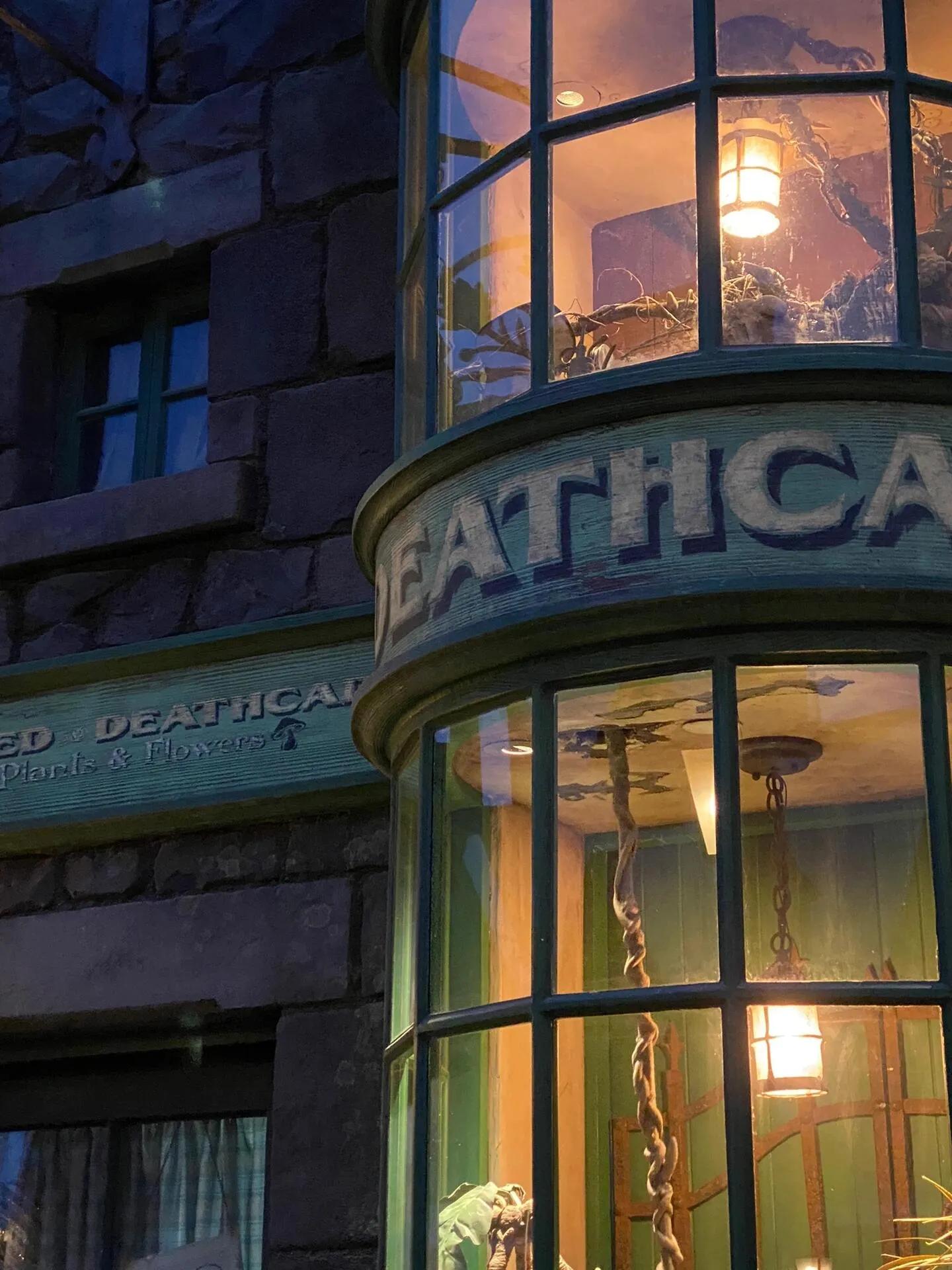 一路上,我路过了无数橱窗,猫头鹰、坩埚、书店、破釜酒吧,一一对应着书中场景,很快就到了城堡脚下。去鹰马飞行的路上会路过海格小屋,小屋门口堆放的南瓜,窗口映出的暖黄色光芒,时不时出现海格的剪影,仿佛下一秒海格就会开门对你说:“哦!嗨!我记得你小家伙,要来一块岩石饼吗?”如果在黄昏时分乘坐鹰马飞行,还能看一看落日余晖中的魔法世界。