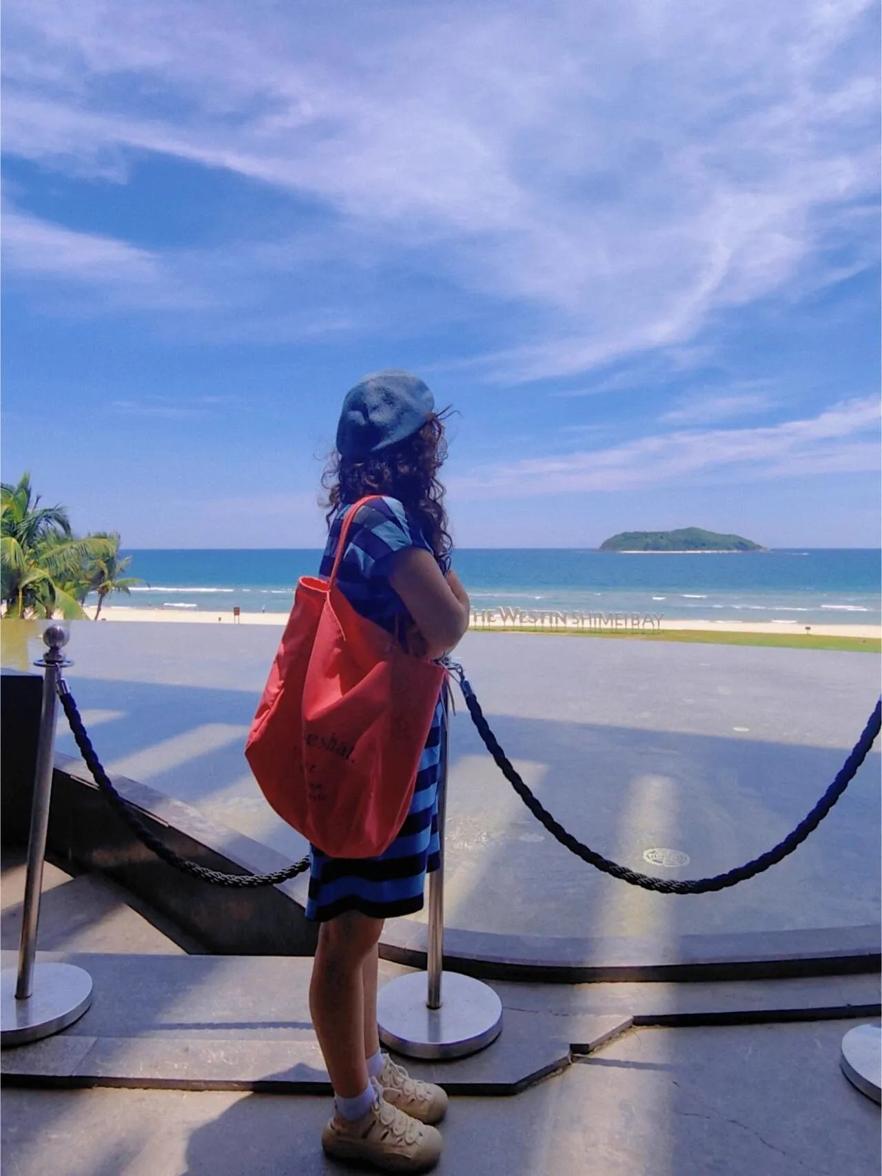 随后前往石梅湾,可以在粉色沙滩游玩。穿过威斯汀酒店大堂就能到达,这里遮阳伞和座椅都是粉色的,拍照打卡的地方很多。
