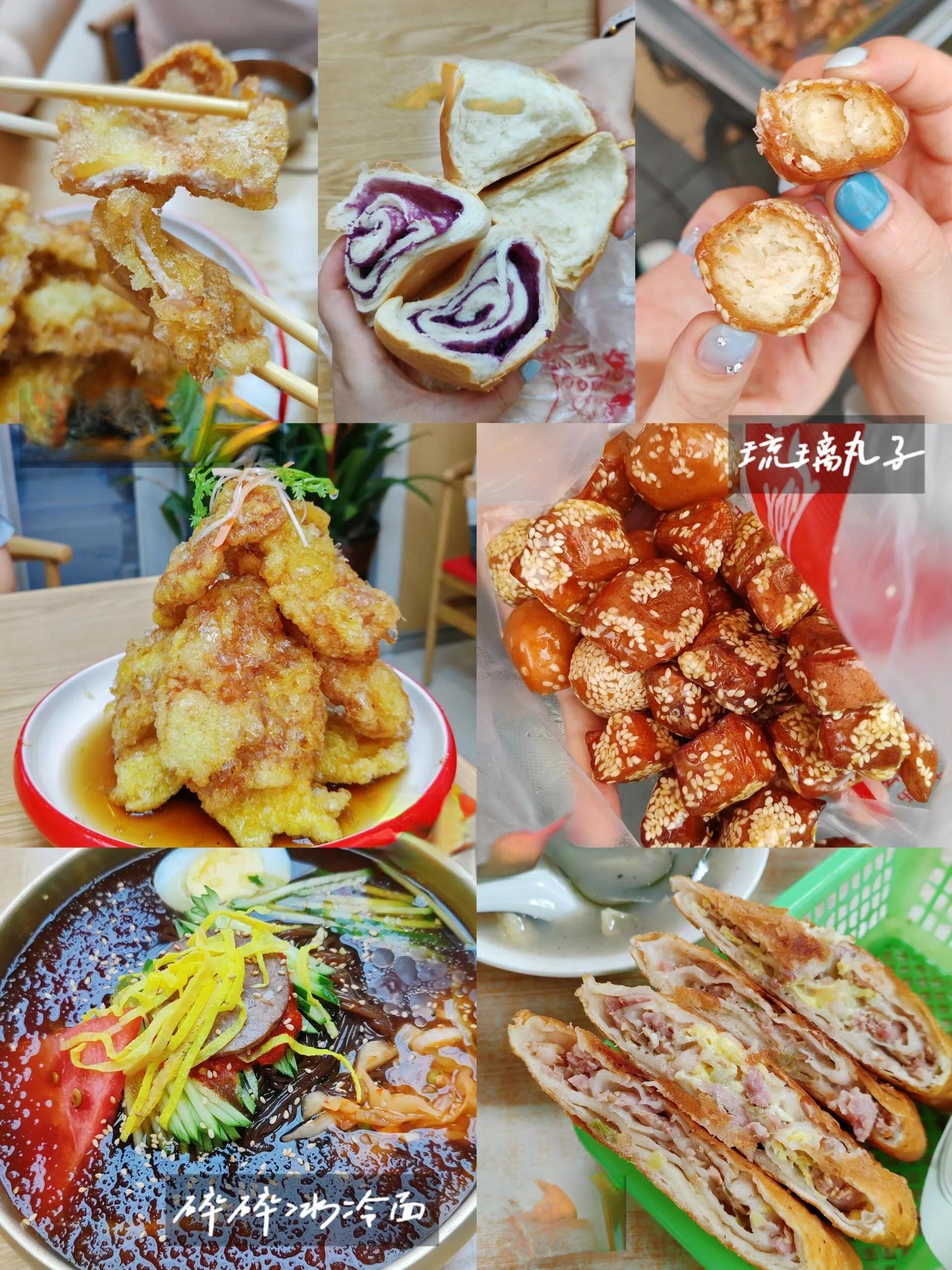 最后我们来到了育新街,这里是小吃街。 我们品尝了琉璃丸子、炸鸡腿和烤馒头。 晚餐我们随意走进了一家朝族饭店 ,幸运地成为最后一桌客人。这里的气泡锅包肉非常出名,几乎每桌必点,味道确实不错。