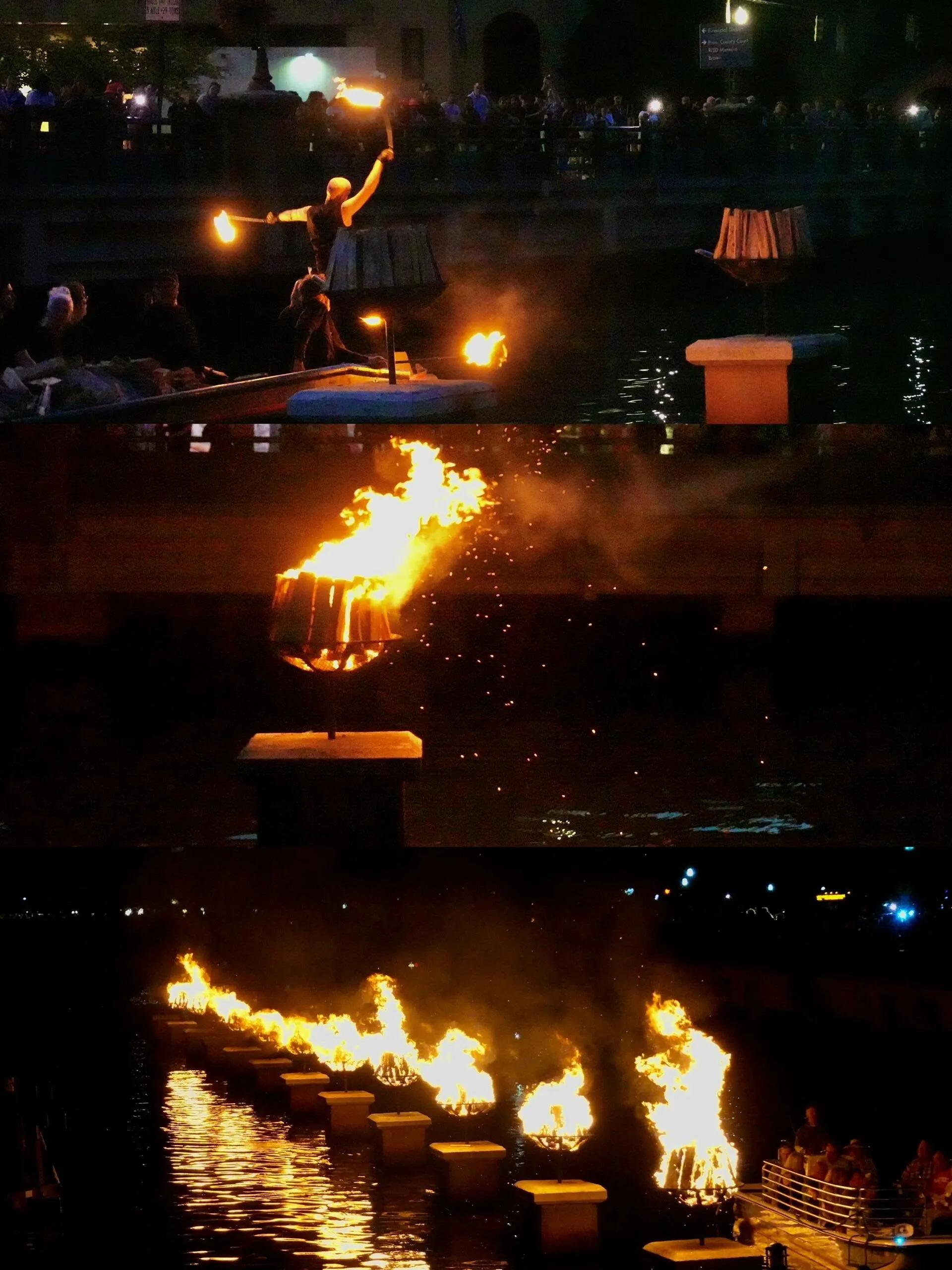 随着天色渐暗,河畔响起醉人的法语歌。船只沿水路而来,船头的表演者挥舞火炬起舞,同时点燃河上准备好的木制灯笼。整个过程井然有序,充满松弛感,令人联想到塞纳河上的巴黎奥运。