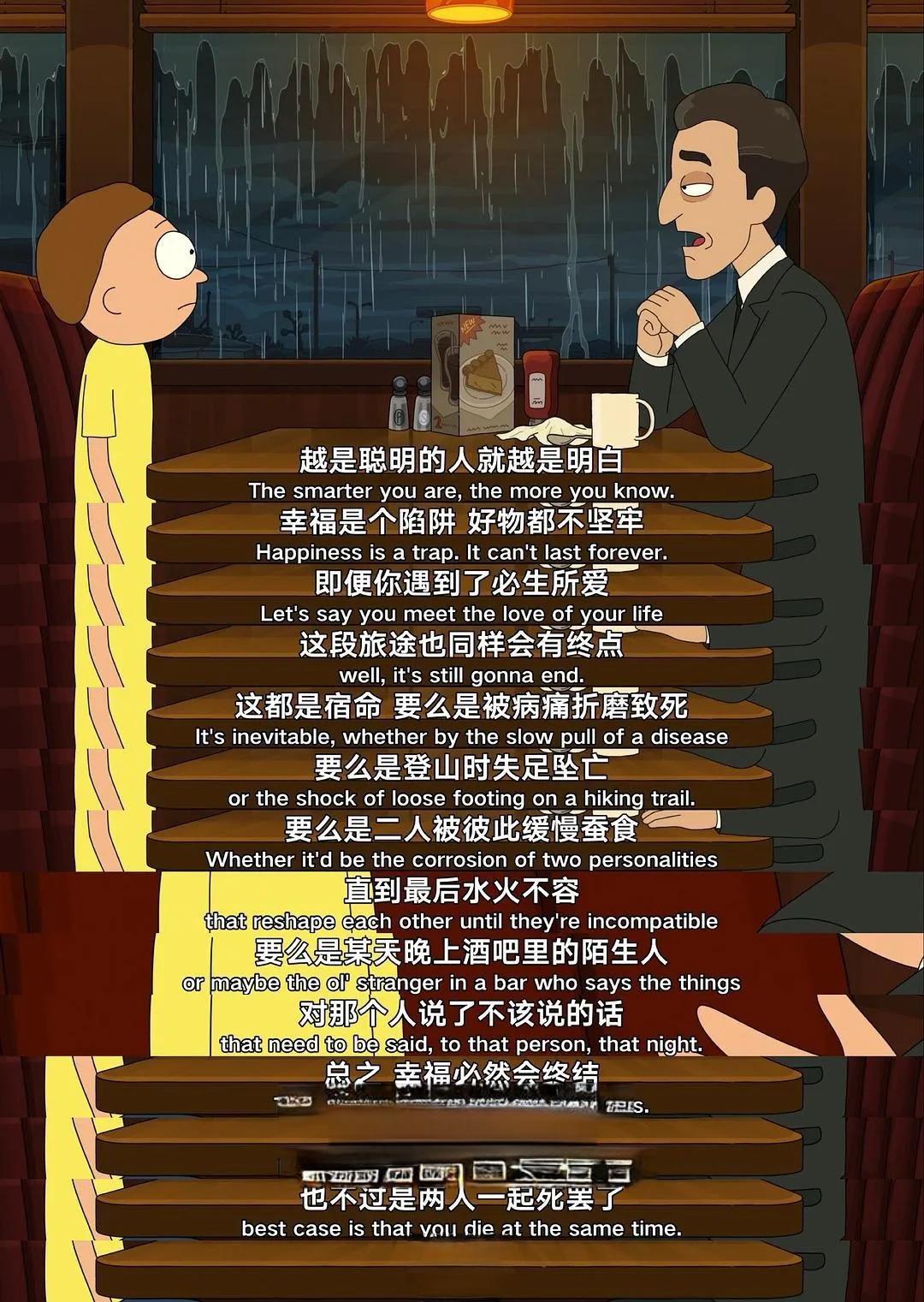 第七季最引人注目的特点之一是其更加大胆和深刻的叙事尝试。例如,在第四集中,莫蒂发现自己吃的意面实际上是另一个星球上自杀的人的尸体变成的。这个设定不仅挑战了观众的想象力,更引发了对生命意义和道德伦理的深刻思考。正如一位观众所言:“《瑞克和莫蒂》就是混乱的制造者,道德的低洼地,老实人的梦魇和观众的三观粉碎机。”