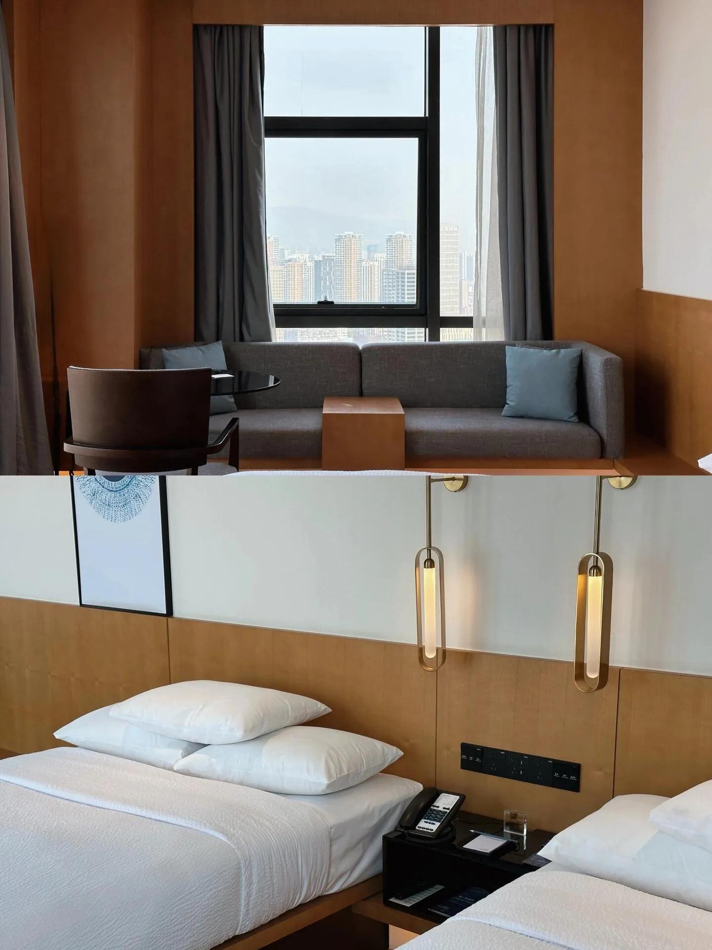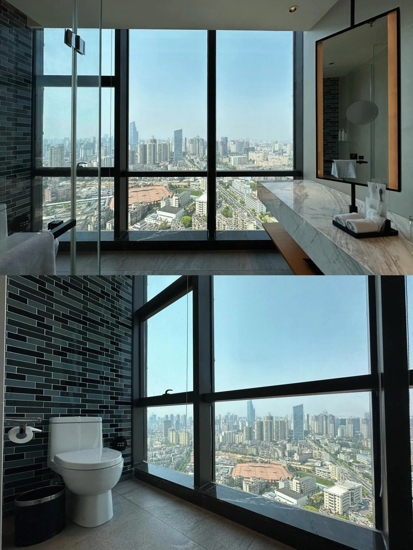新迎万枫的一大亮点是其高层视野。 20多层的空中大堂让人眼前一亮。我入住的是西南侧的角房,卧室拥有两面落地窗,视野极佳。卫生间同样临窗而建,近处可欣赏五一广场的恒隆,远处甚至能眺望到昆明市区西北侧的远山和日落美景。