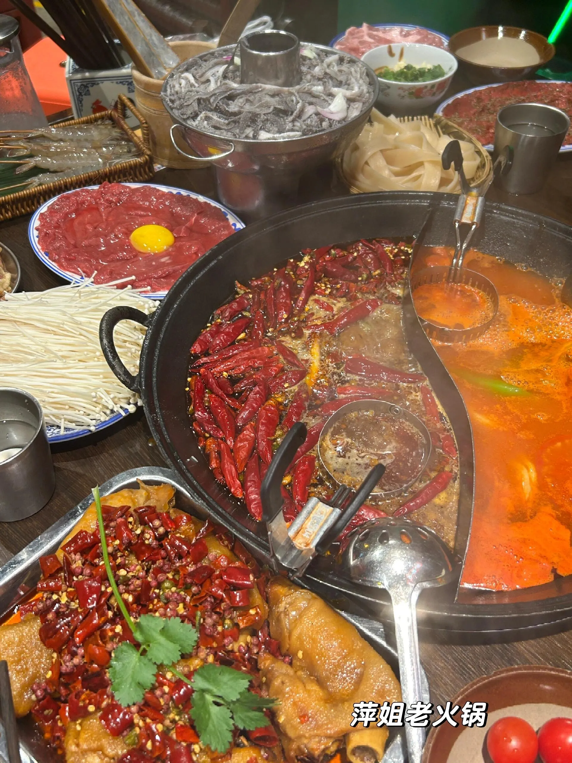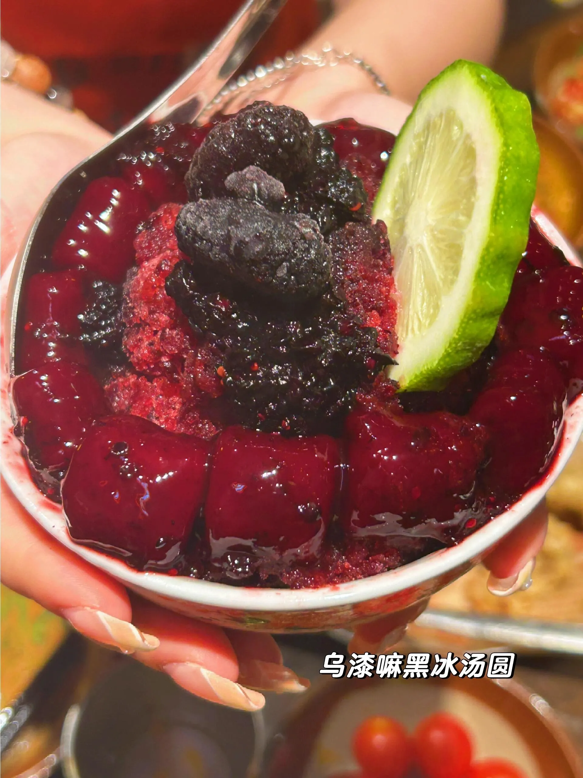 最后,如果想吃火锅,可以去萍姐火锅。店内复古风格的装修很适合拍照,菜品也很丰富,鸡蛋嫩牛肉、酱猪蹄、涮牛肚都值得一试。别忘了尝尝他们家的特色甜品——乌漆嘛黑冰汤圆,杨梅桑葚味浓郁,汤圆口感有嚼劲。
