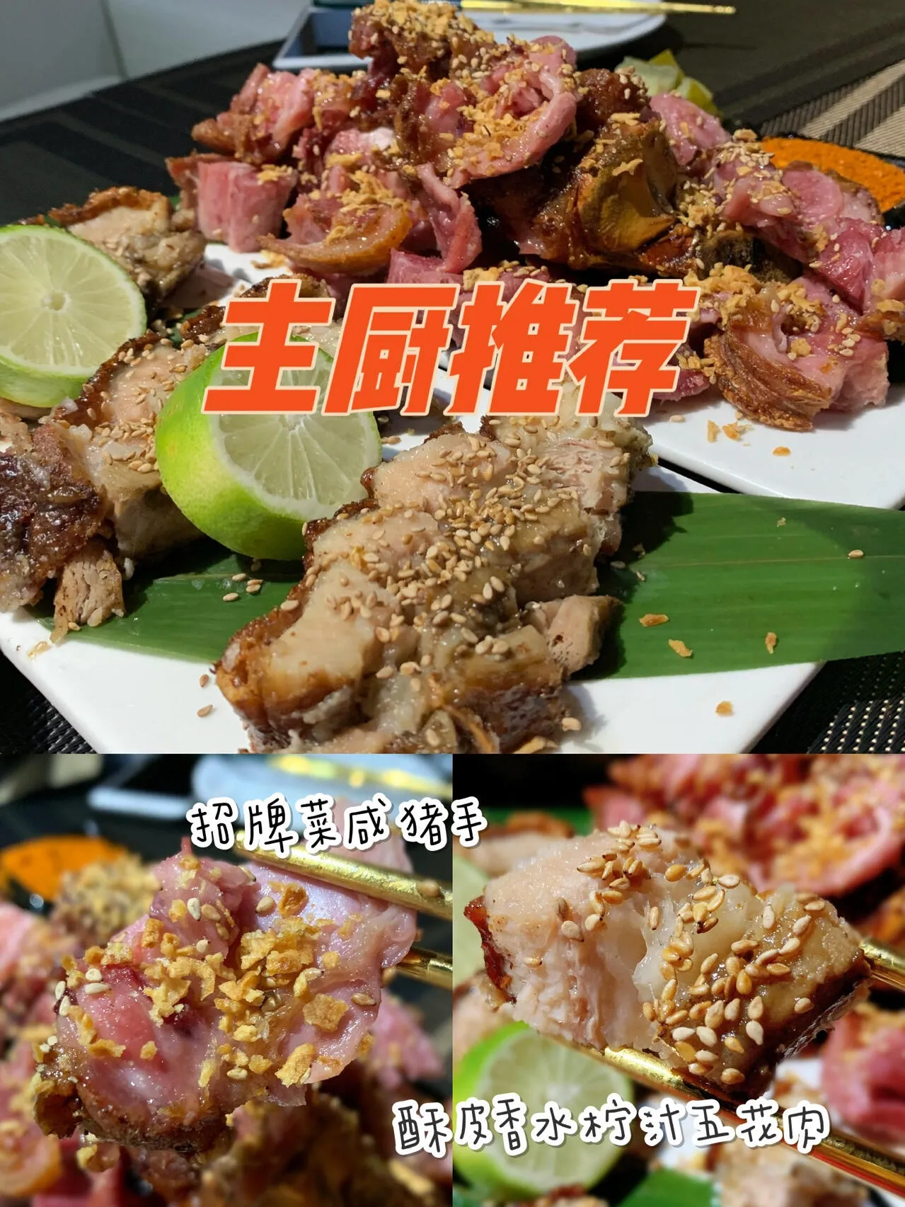 招牌咸猪手&酥皮香水柠汁五花肉:这两道菜绝对是必点!猪肘子肥瘦适中,带点筋,味道很棒。配的酸黄瓜很开胃。烤五花肉外焦里嫩,焦皮很香,整体偏甜。