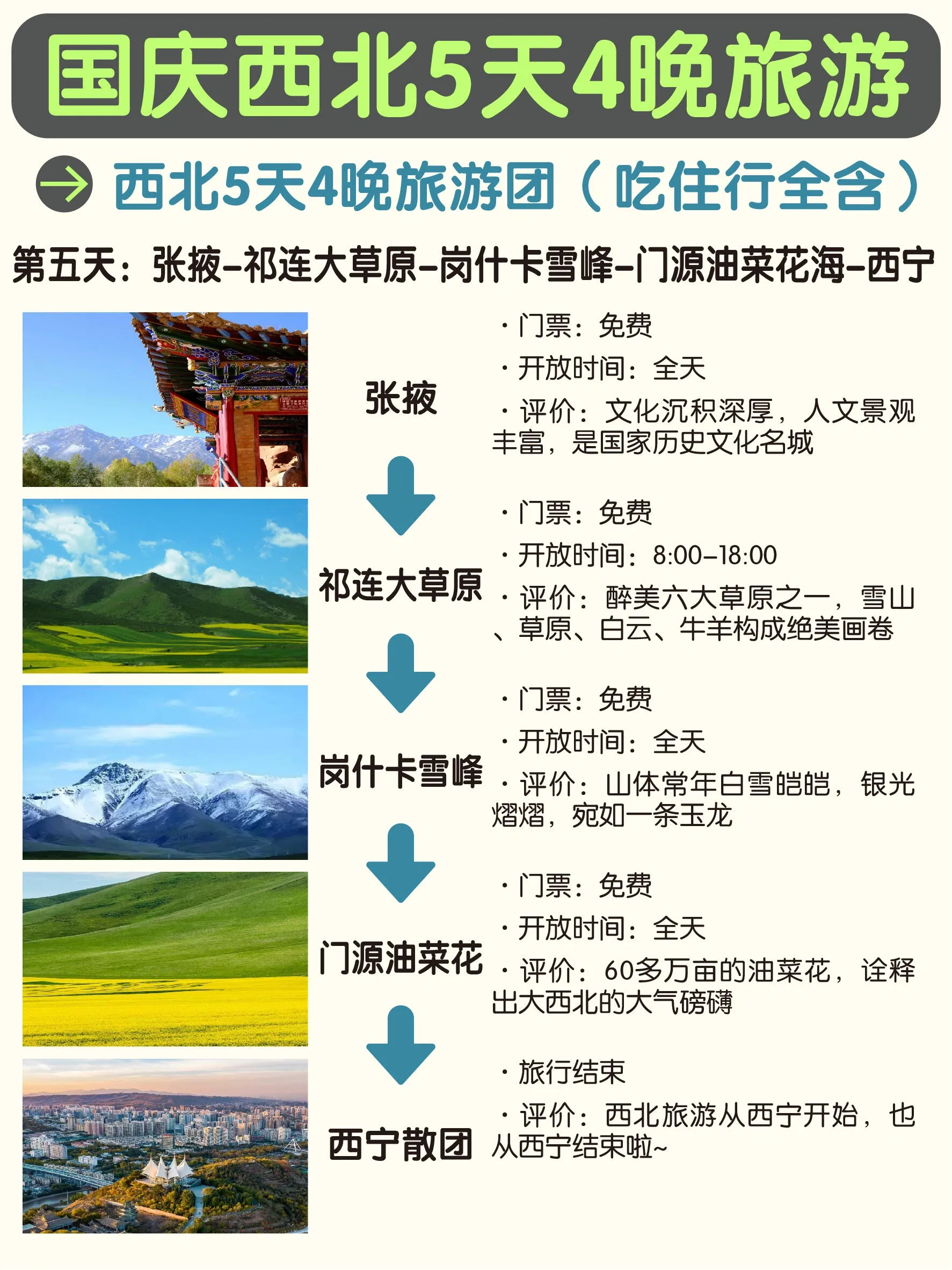 第五天:从张掖出发,途经祁连大草原,远眺岗什卡雪峰,如果是花季还可以欣赏门源油菜花海,最后返回西宁结束行程。