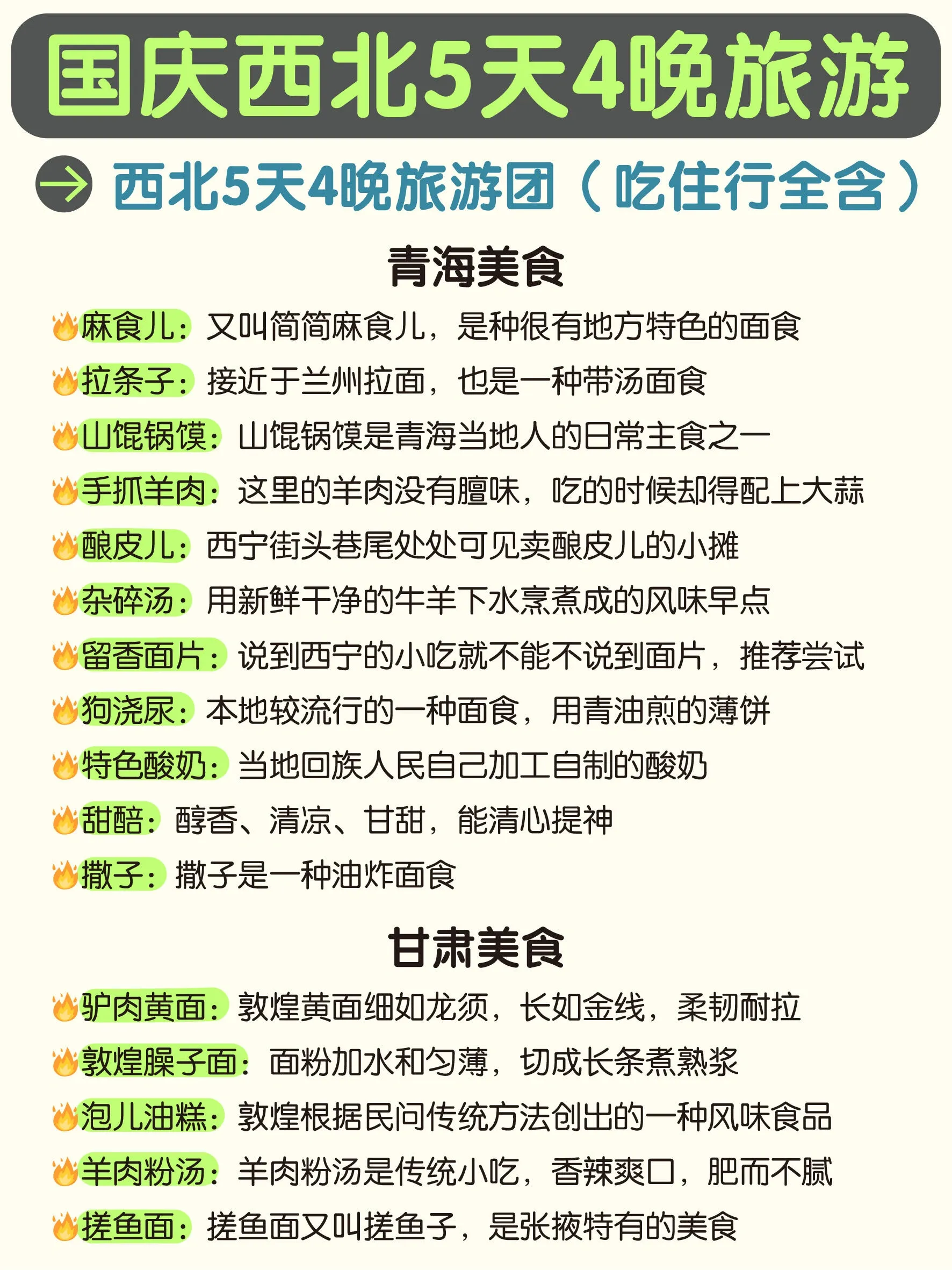 在美食方面, 青海有许多特色美食值得品尝 ,如麻食儿、拉条子、手抓羊肉、酿皮儿等。甘肃的特色美食包括驴肉黄面、敦煌臊子面、羊肉粉汤等。这些地方特色美食都能让旅行者更深入地体验西北的饮食文化。
