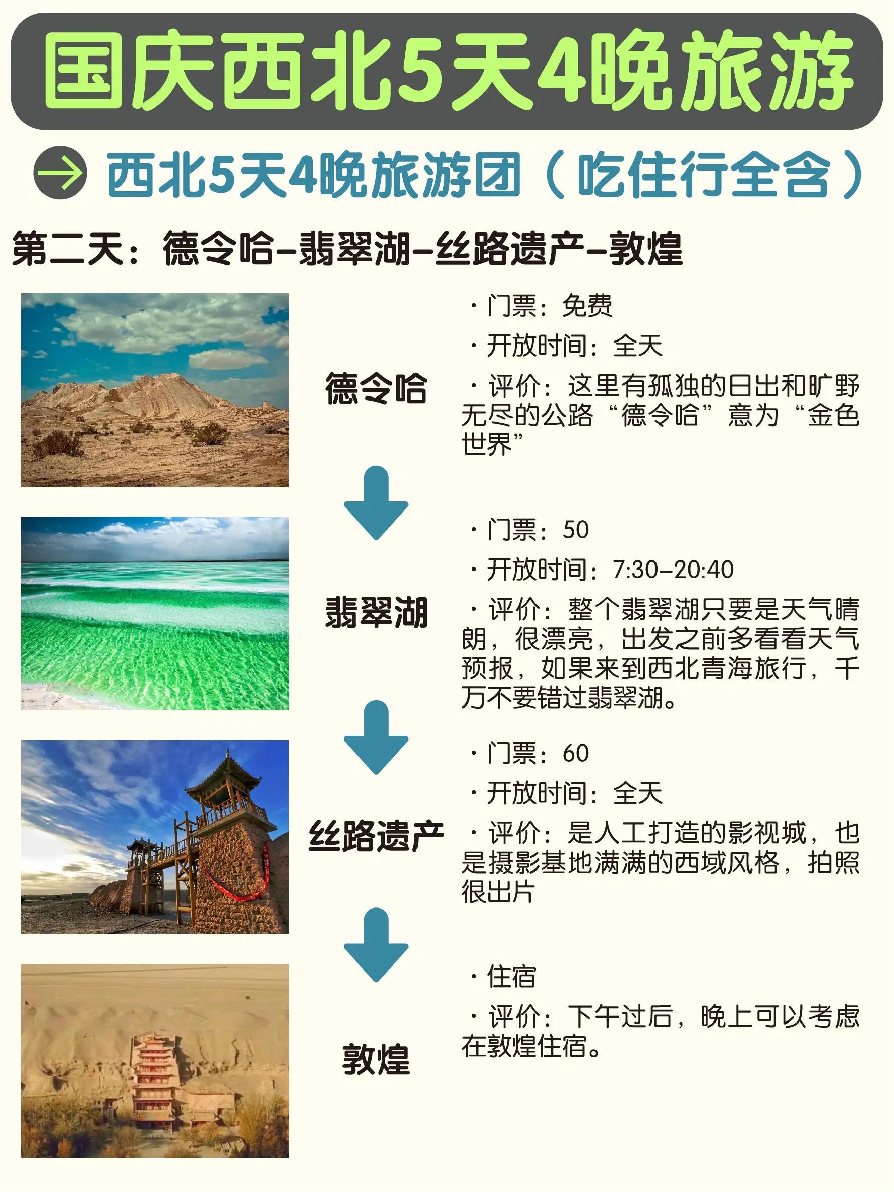 第二天:从德令哈出发,游览翡翠湖和丝路遗产,最终到达敦煌。
