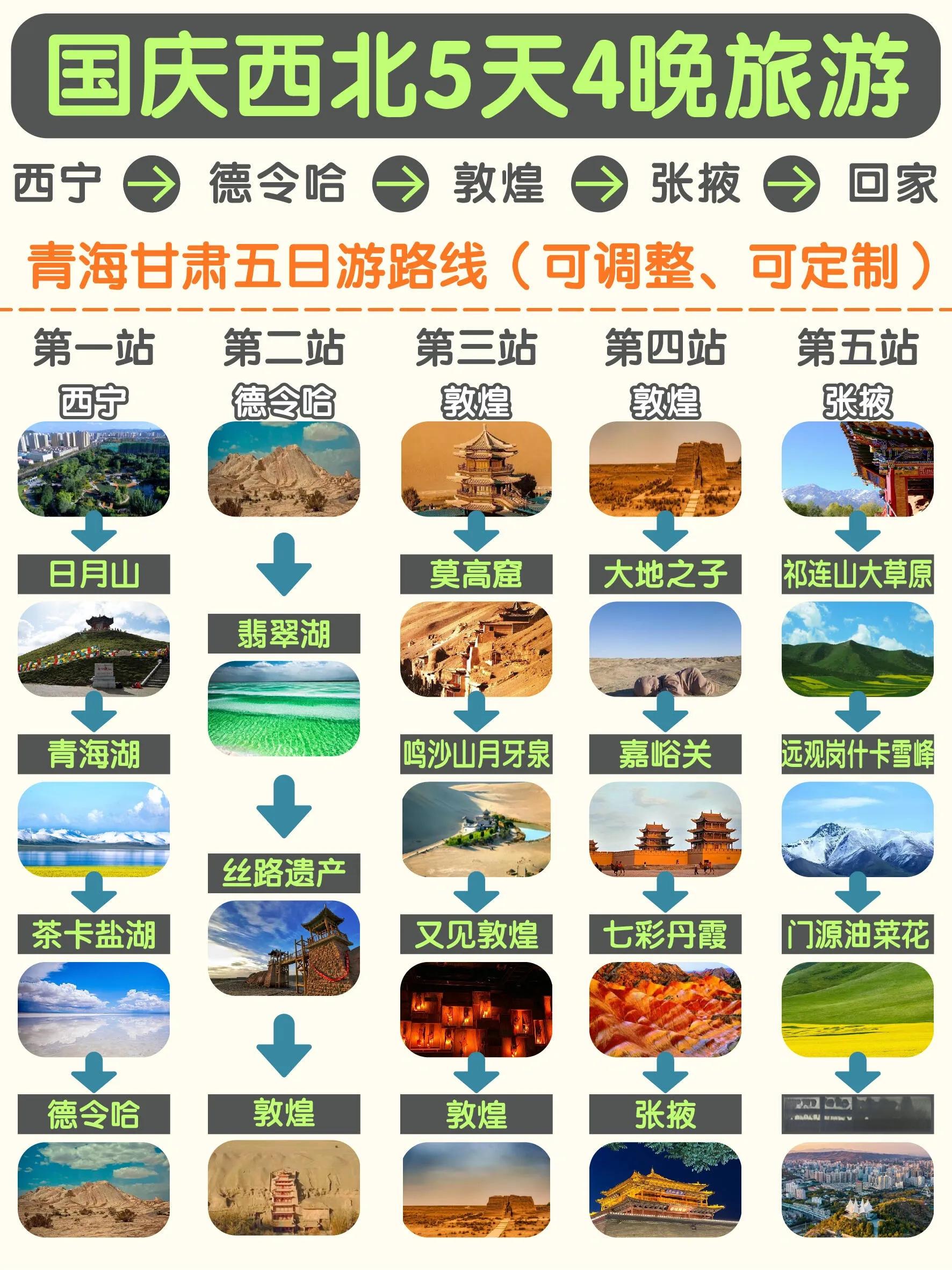 青甘大环线是探索大西北的经典路线 ,涵盖了青海和甘肃两省的众多著名景点。这份攻略为期5天,包含了丰富的自然风光和人文景观,适合想要深入体验西北魅力的旅行者。