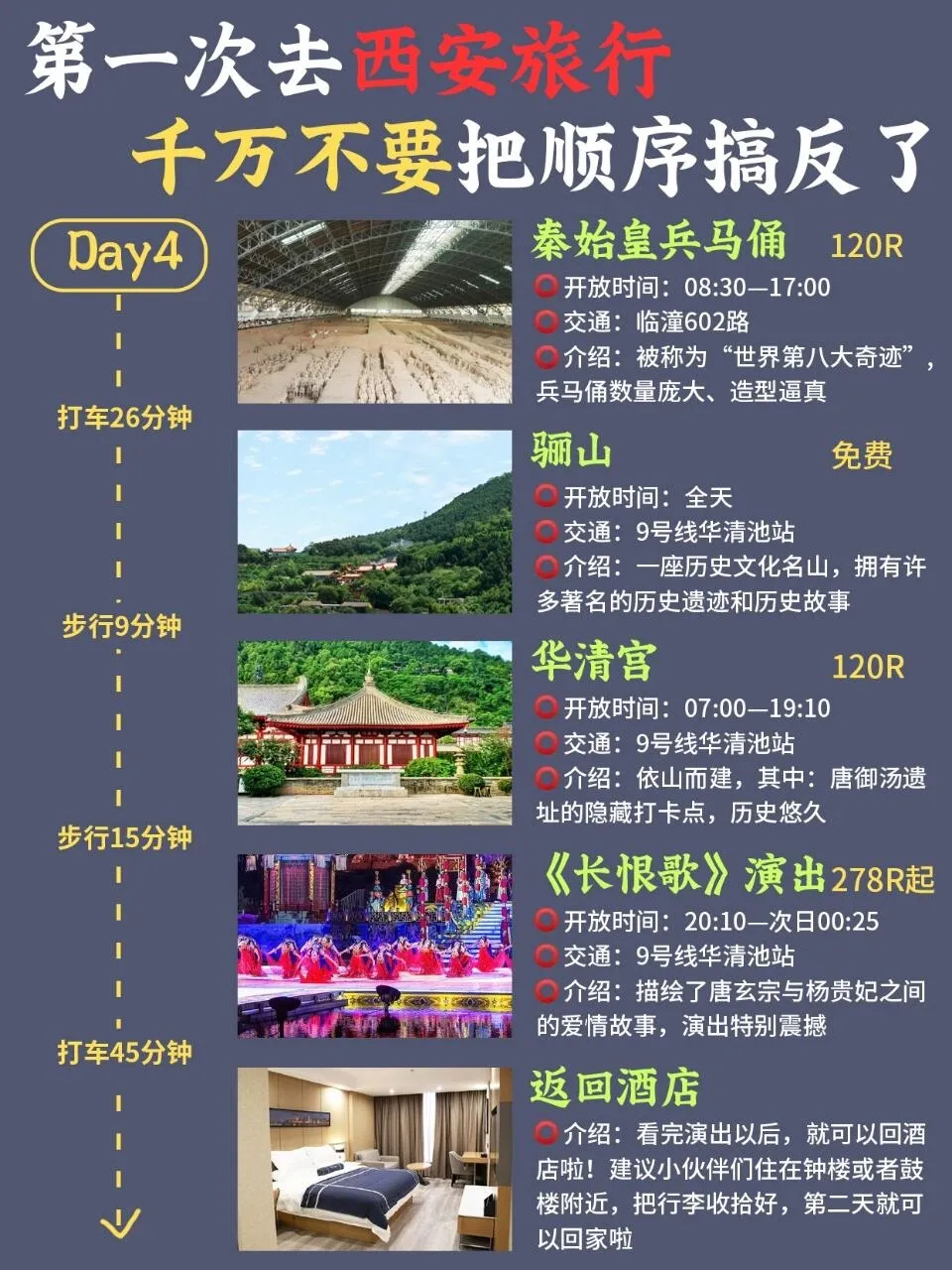 秦始皇兵马俑 → 骊山 → 华清宫 → 《长恨歌》演出 → 返回酒店(钟楼或鼓楼附近)
