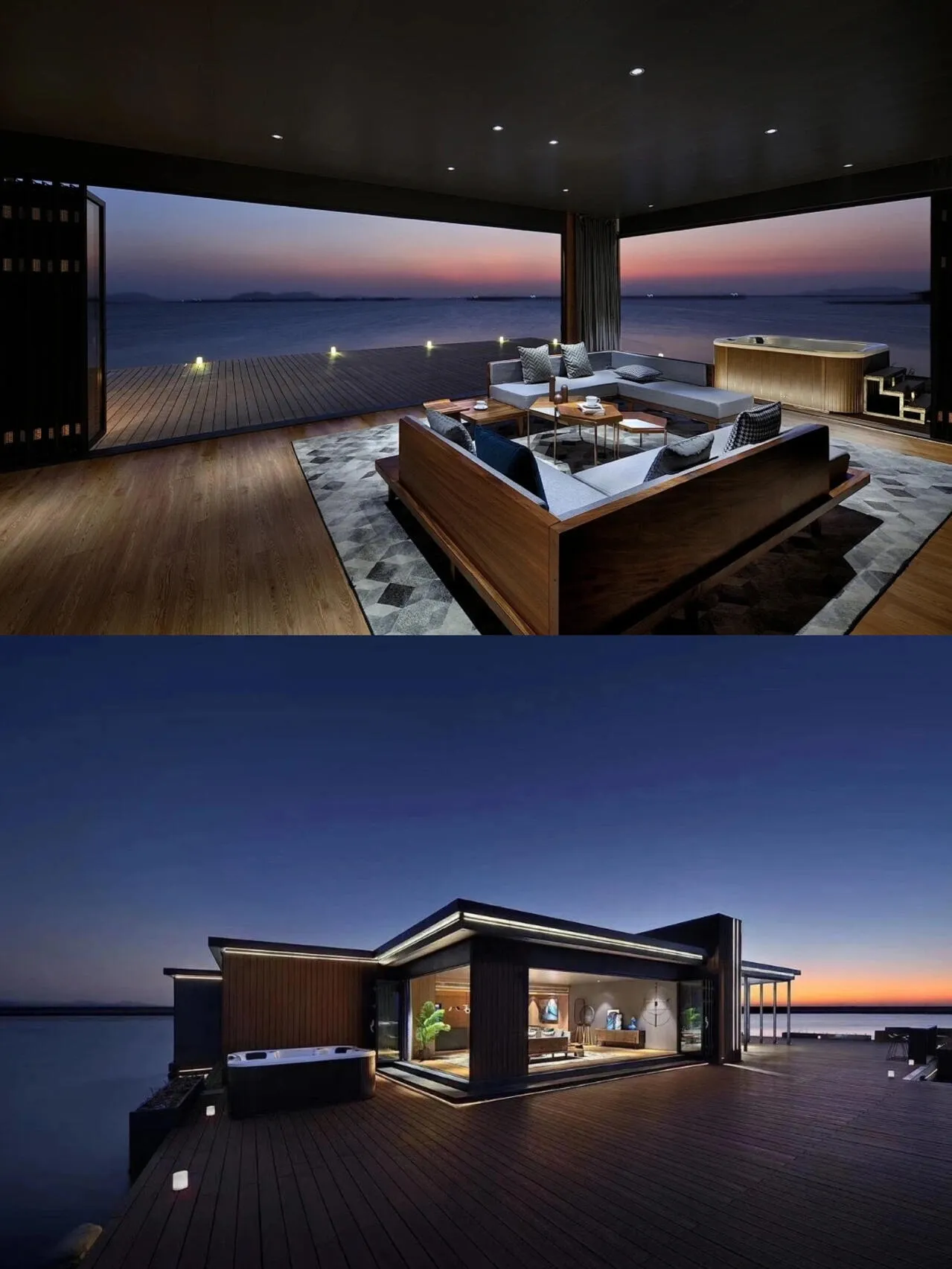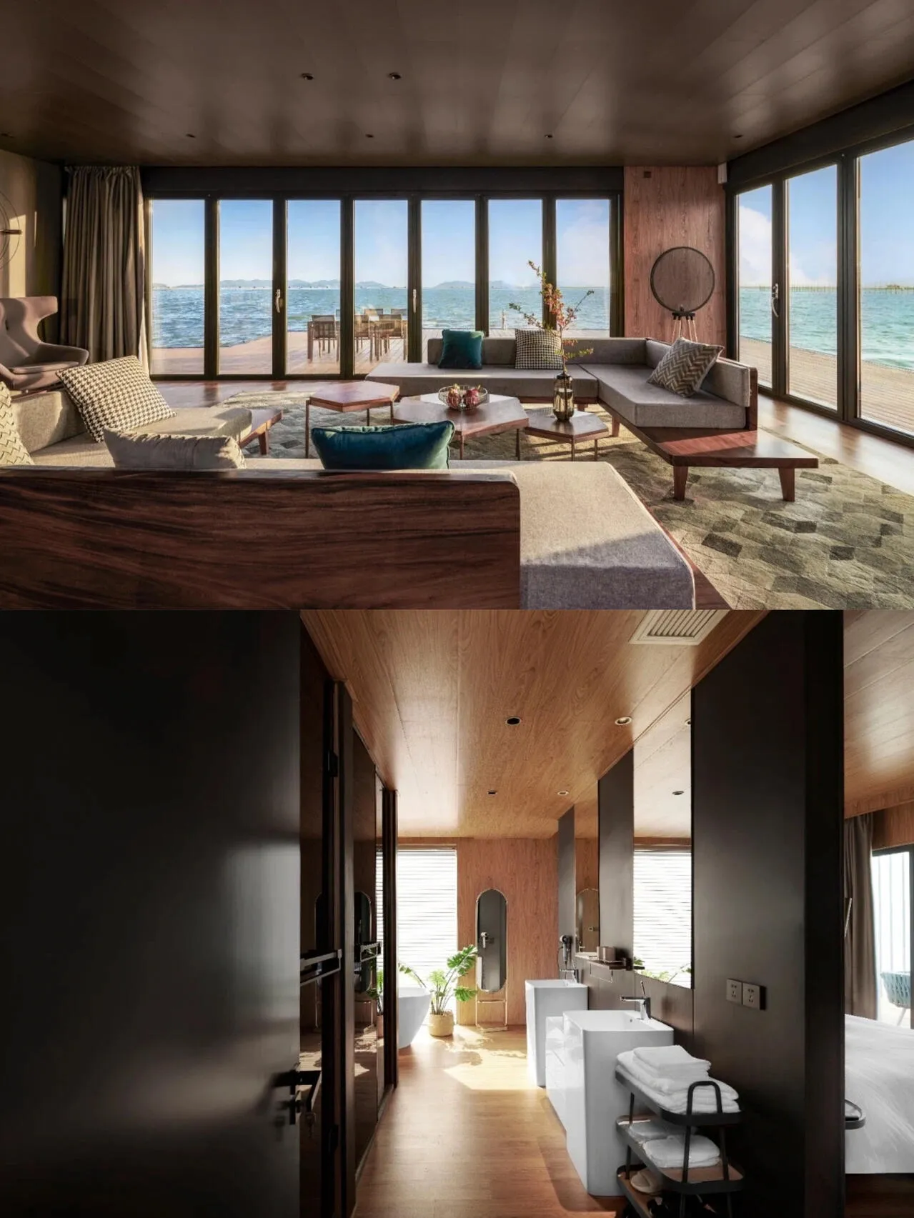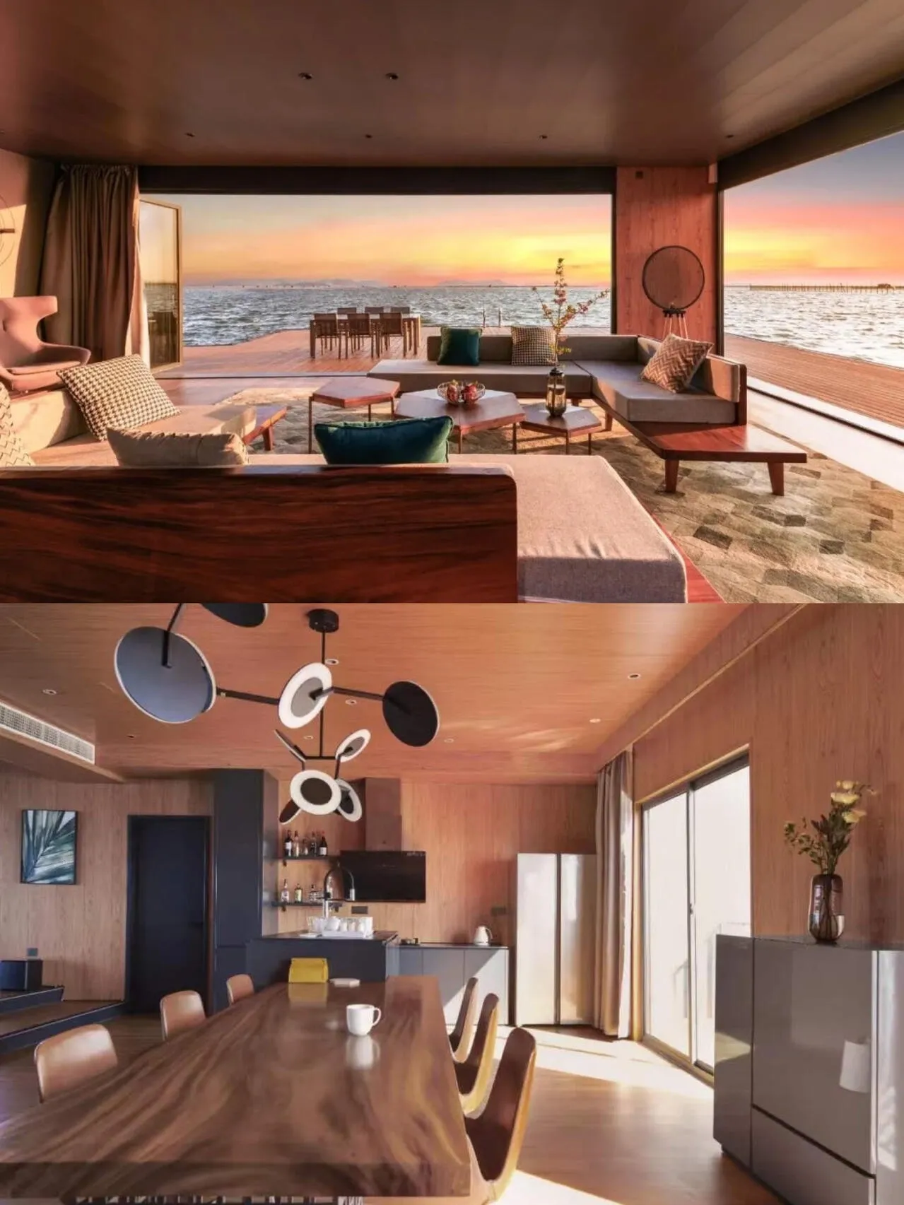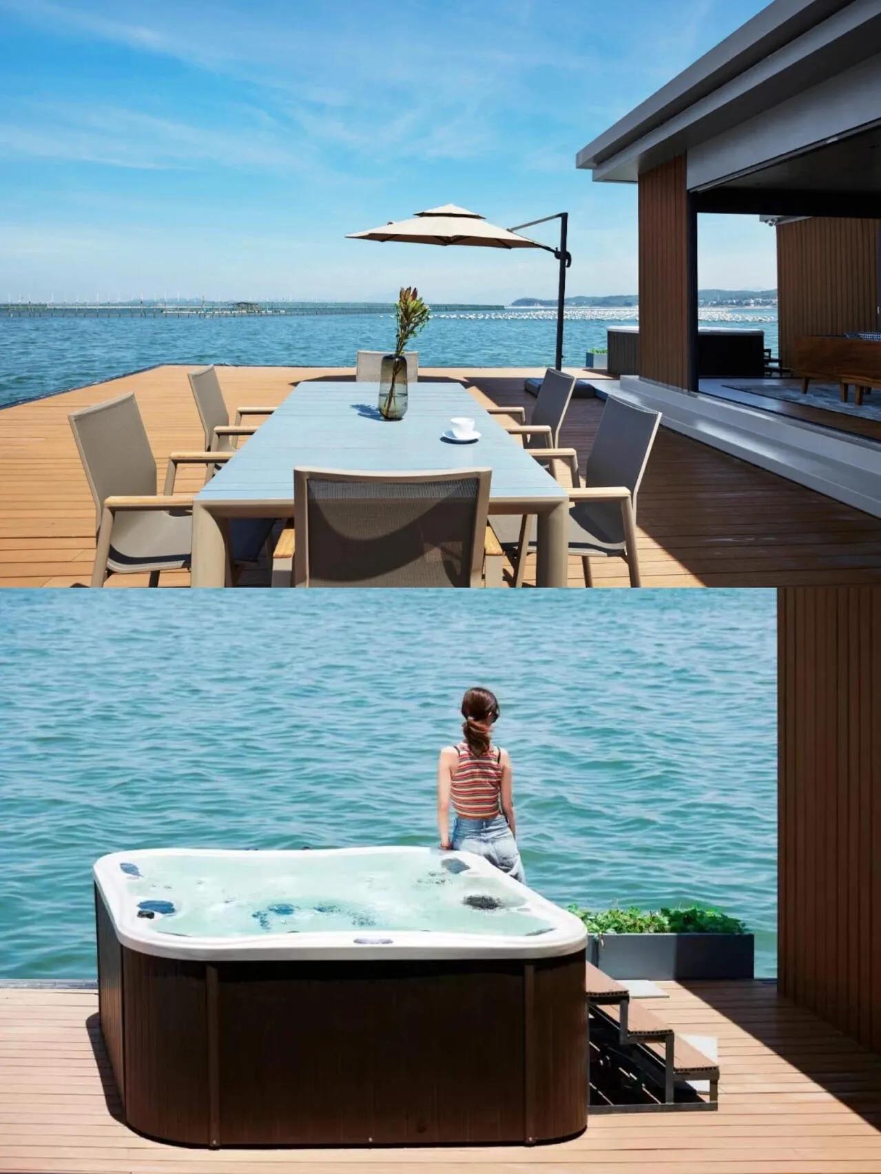 主人花了400万,在海上建成了这座酒店。600平的3房别墅,有宽敞的客厅,室内户外都有厨房,户外露台超级大。喜欢游泳的朋友这下过瘾了,不会游泳的也可以在户外平台的按摩浴缸玩水,总之泳衣一定要带上!