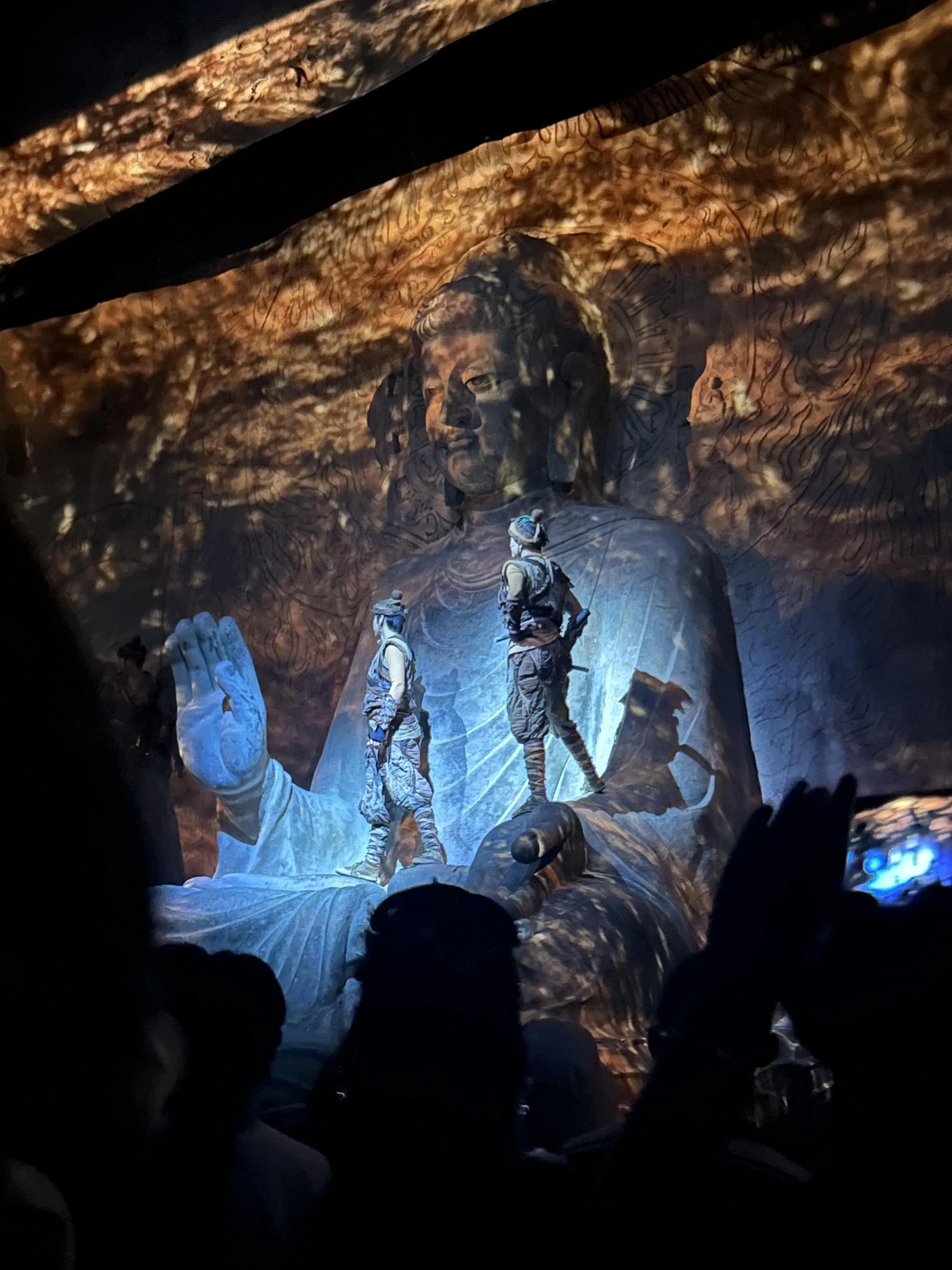 这个环节1:7比例还原了卢舍那大佛,真是震撼人心。演员们吊着威亚在石壁上飞檐走壁,模拟雕刻石窟的场景。既惊险刺激又赏心悦目!