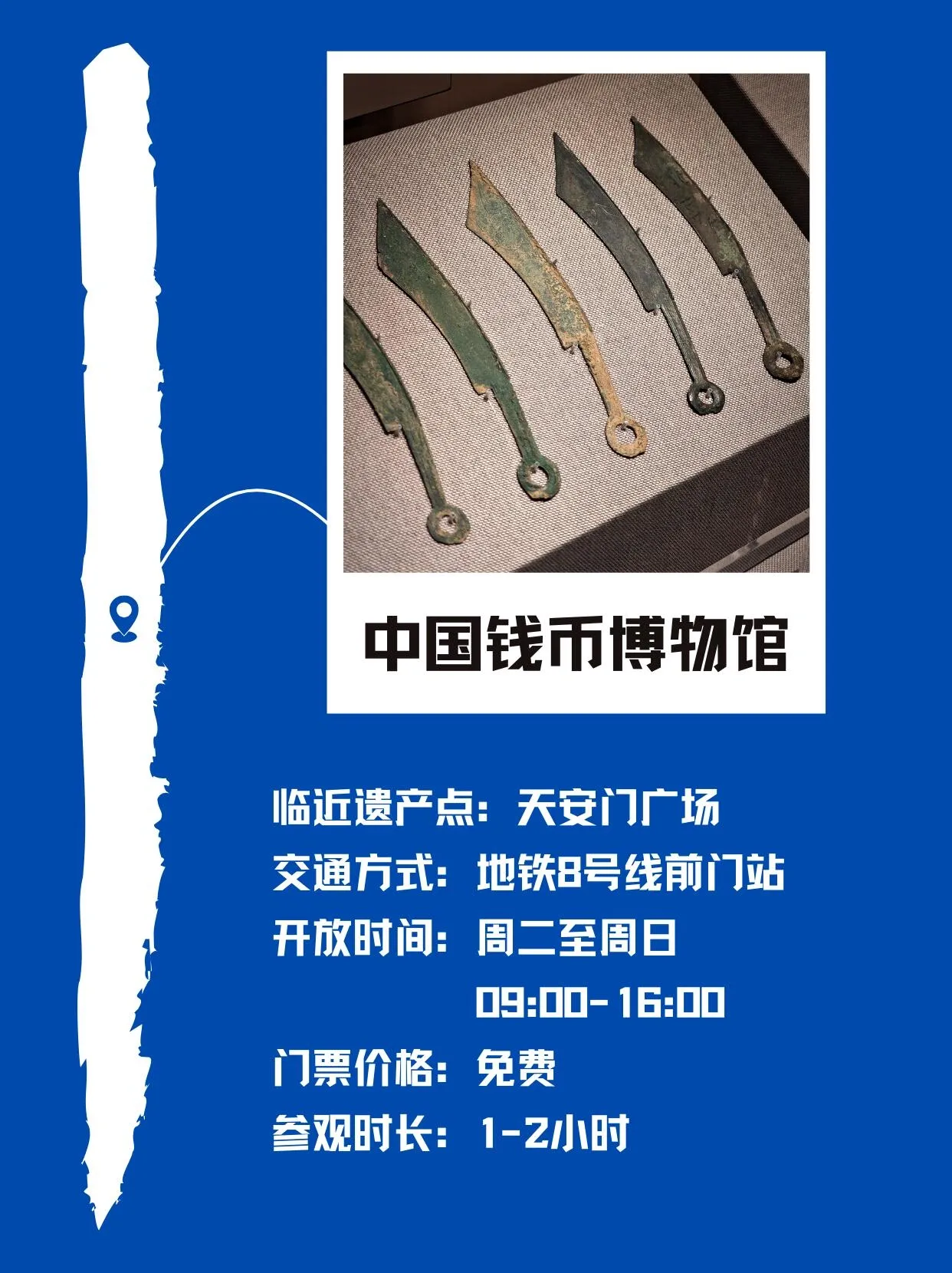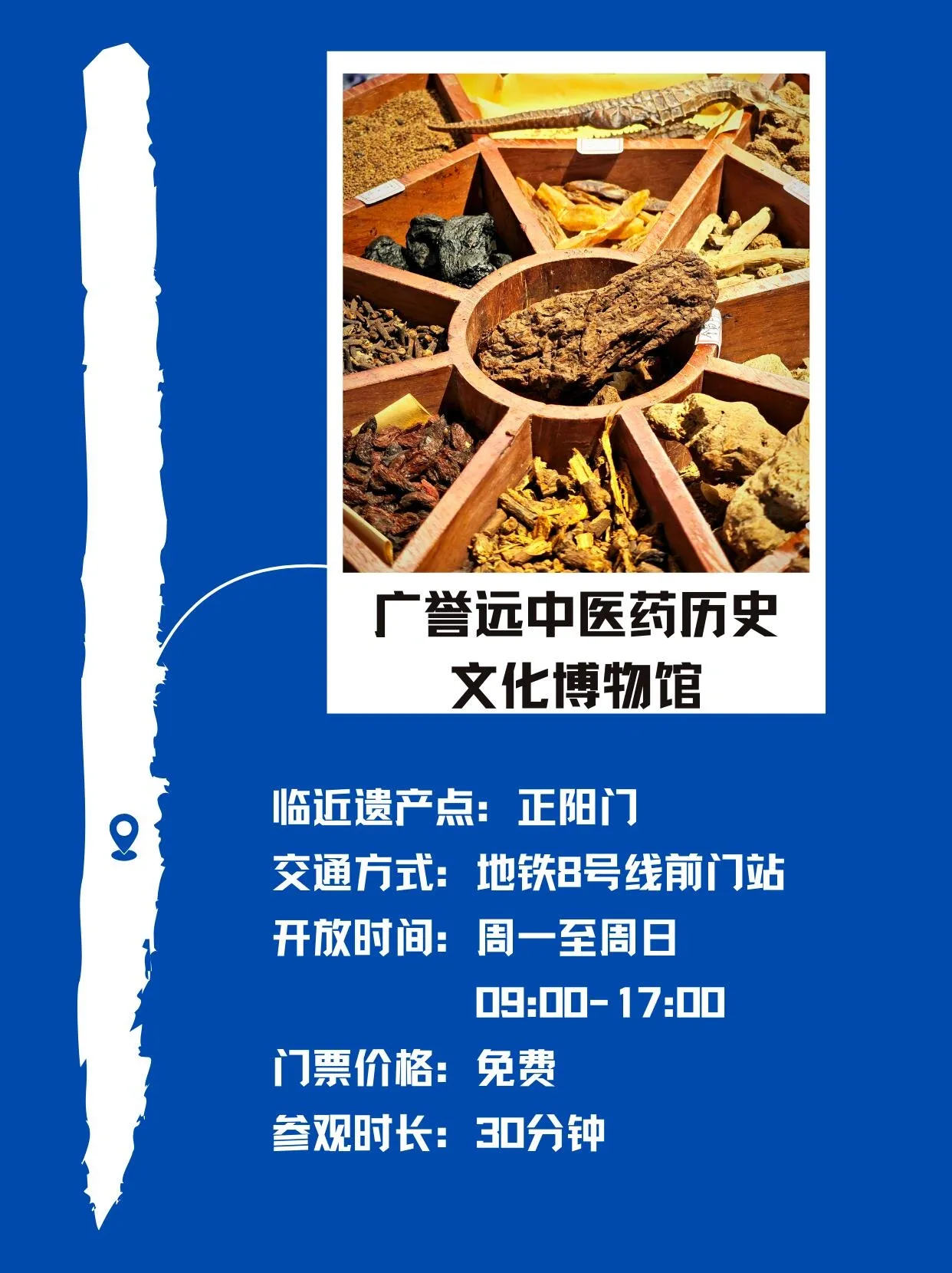 自南向北排列,这12家博物馆包括:首都粮食博物馆、北京古代建筑博物馆、天桥印象博物馆、中国自然博物馆、北京二锅头酒博物馆、广誉远中医药历史文化博物馆、中国铁道博物馆、北京市规划展览馆、中国钱币博物馆、中国国家博物馆、故宫博物院、北京市钟鼓楼文物管理所。