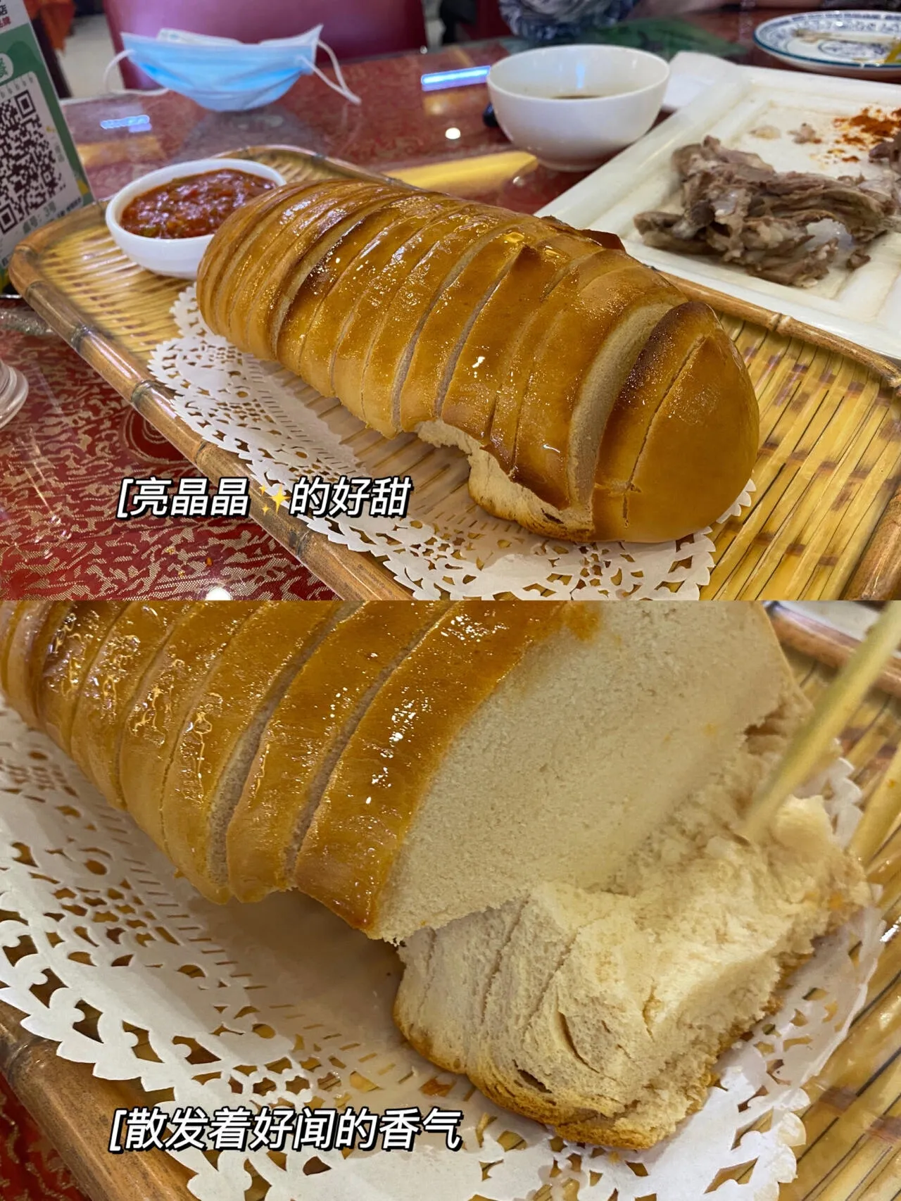 烤馍:需要烤四十分钟。有点像面包,没那么松软,个人觉得比面包好吃富有特色,干吃、蘸旁边酸甜口的蘸料吃、泡酸汤里都可以。