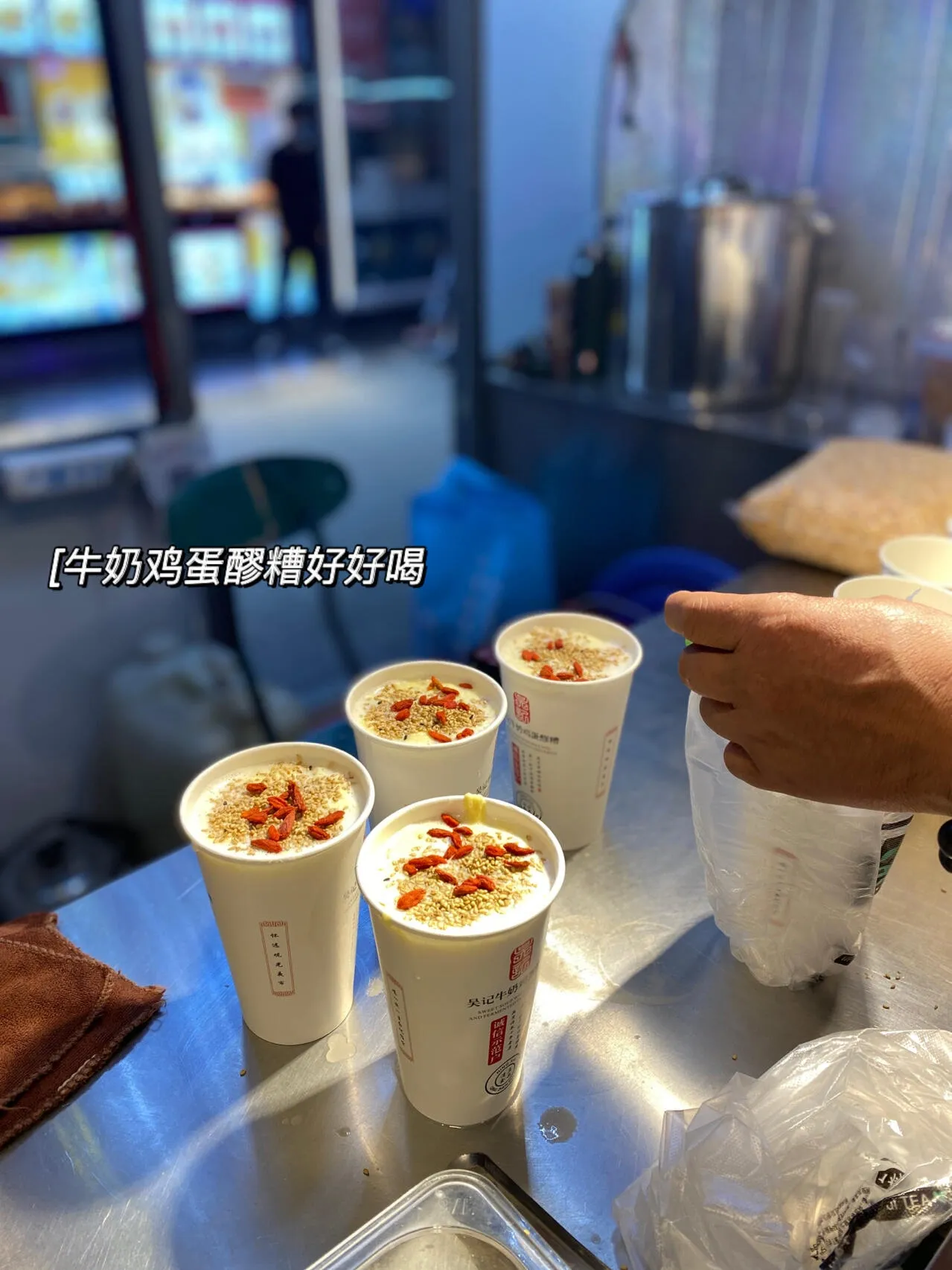 牛奶鸡蛋醪糟:10元,比奶茶好喝多了!非常健康,口感丰富,有白芝麻、核桃仁、枸杞。吃完小吃之后来一杯温热暖胃,清爽完整结束夜市美食之旅。
