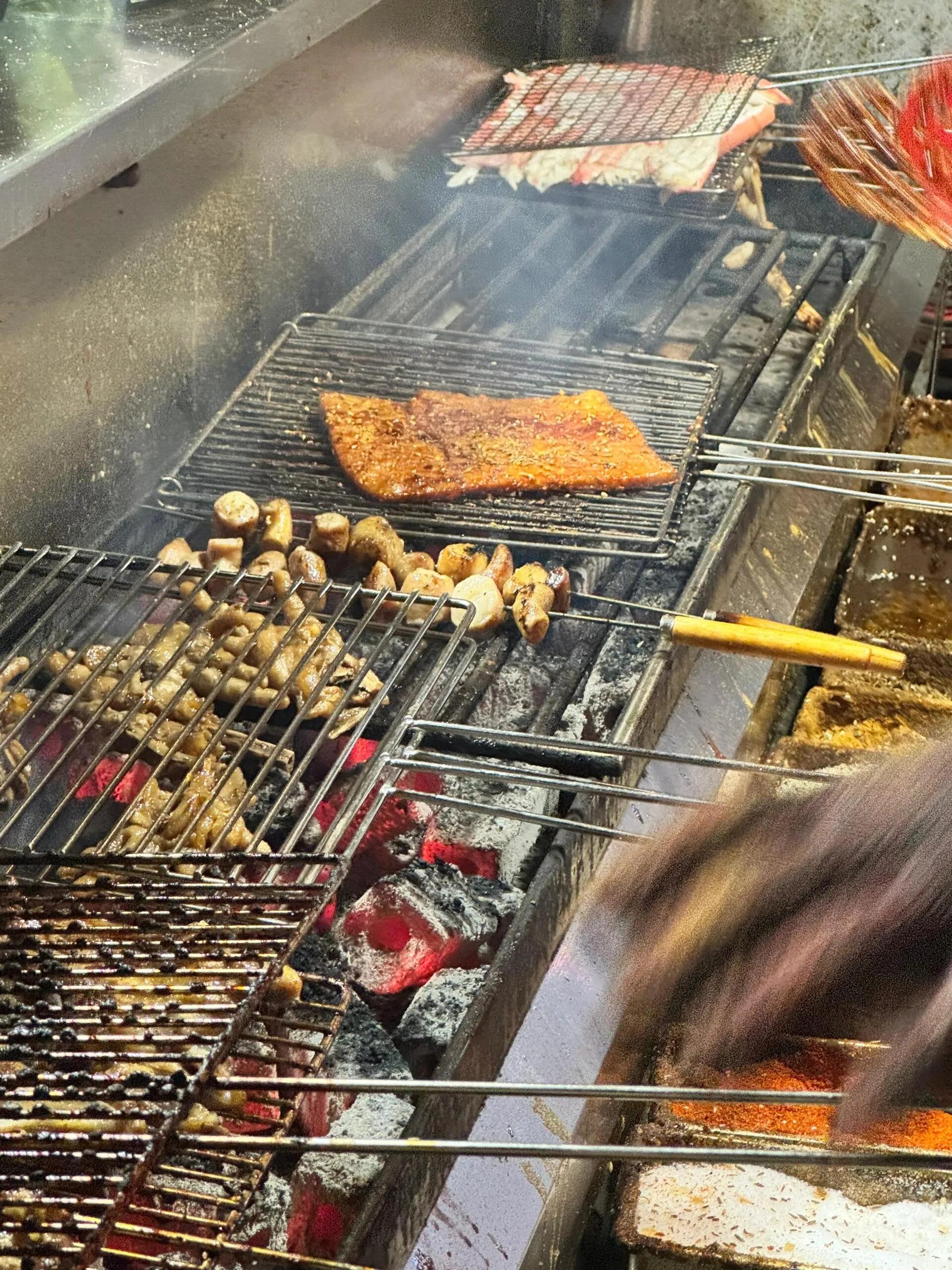 烤油边:烤架上有免费的生菜可以自取,卷着油边吃很不错。记得趁热吃,不然会变硬哦。