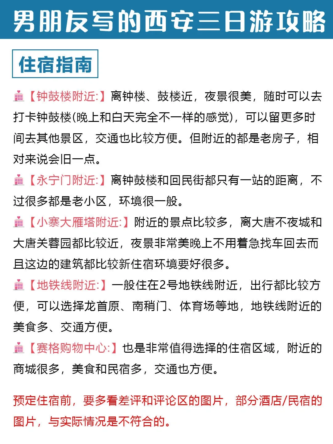 住宿建议选择地铁沿线,钟楼、鼓楼、回民街、大雁塔附近都很方便。选择时多看评论,不要只看网图。