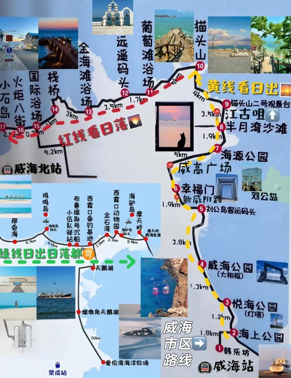 第一天主要游览市区景点。从威海站出发,可以依次游览韩乐坊、海上公园(平替沉船)、悦海公园(可以看到灯塔和秋千)、威海公园(有大相框景观)、刘公岛(可乘船喂海鸥)、新威附路(威海的武康路)、幸福门、海源公园(有许多小船)、半月湾沙滩(适合观赏日出)、江古咀(被称为小济州岛,有果冻海)、猫头山(可乘坐观光车,推荐三号观景台)、远遥码头(有白色编钟)、金海湾栈桥(被称为La La Land)、国际浴场、火炬八街(小镰仓,但人较多)、小石岛(适合观赏日落)和欧乐坊(夜市)。