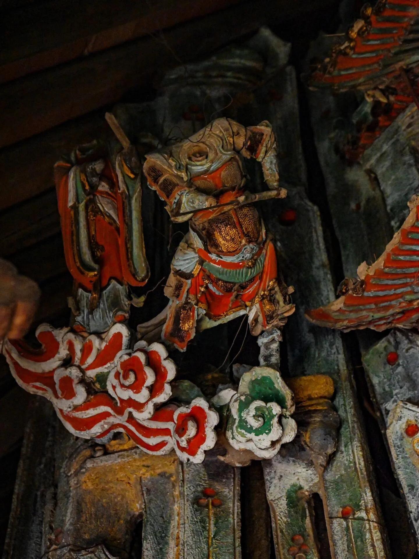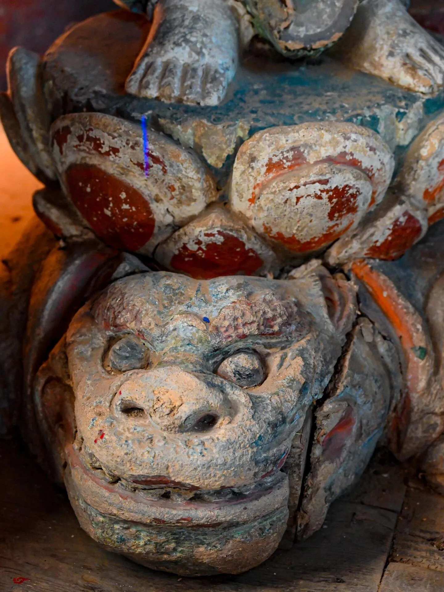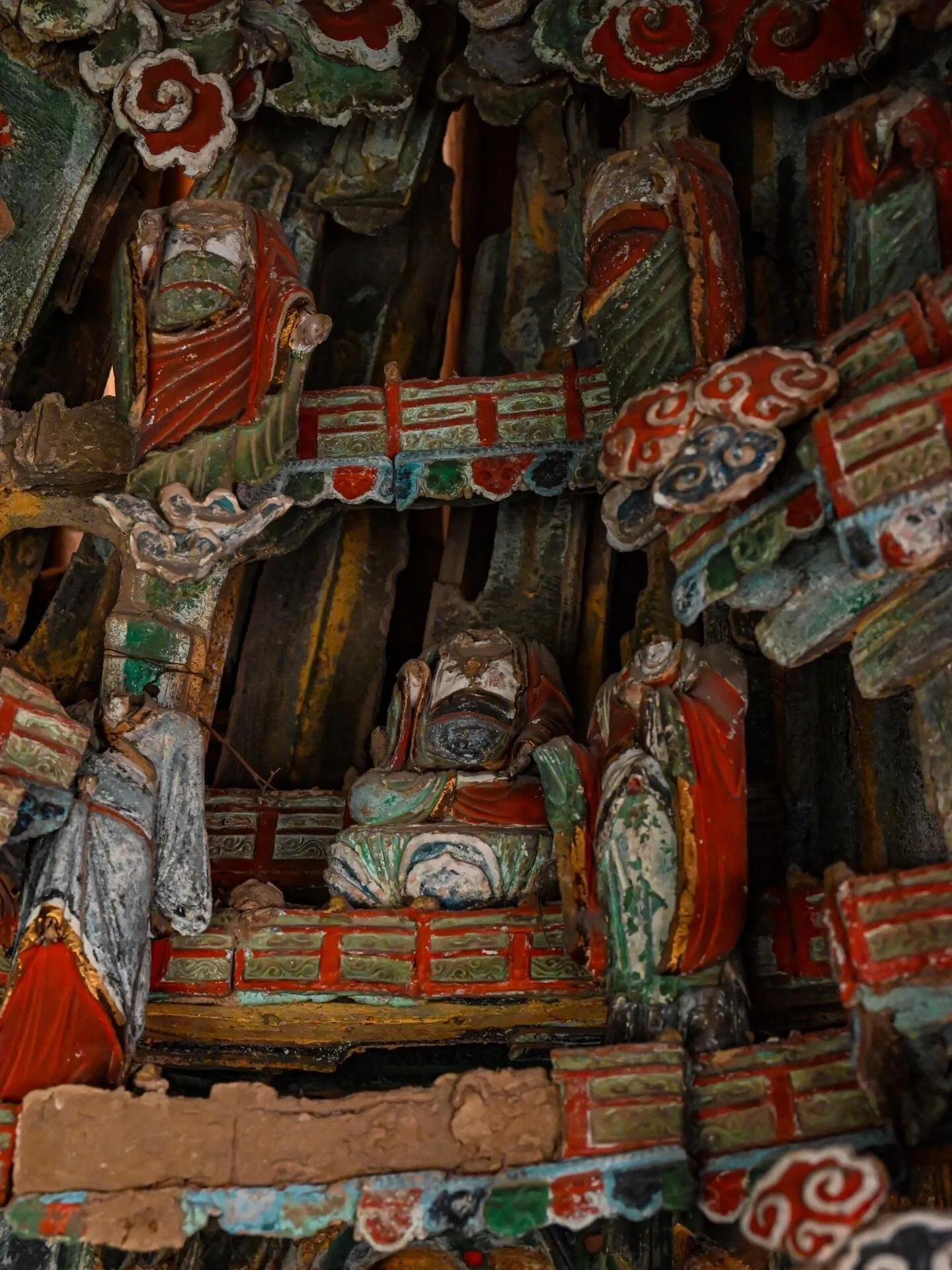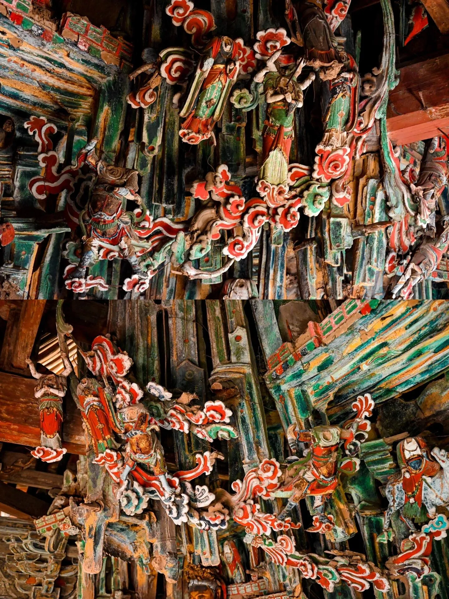 参观悬空寺时,除了惊叹于建筑的精巧和奇险,各个殿宇里的彩塑和悬塑同样值得关注。雷音殿位于南楼的最高层,供奉华严三圣,周围布满悬塑,包括亭台阁楼、24位飞天和18罗汉。可惜的是,大部分悬塑头部已经残缺。