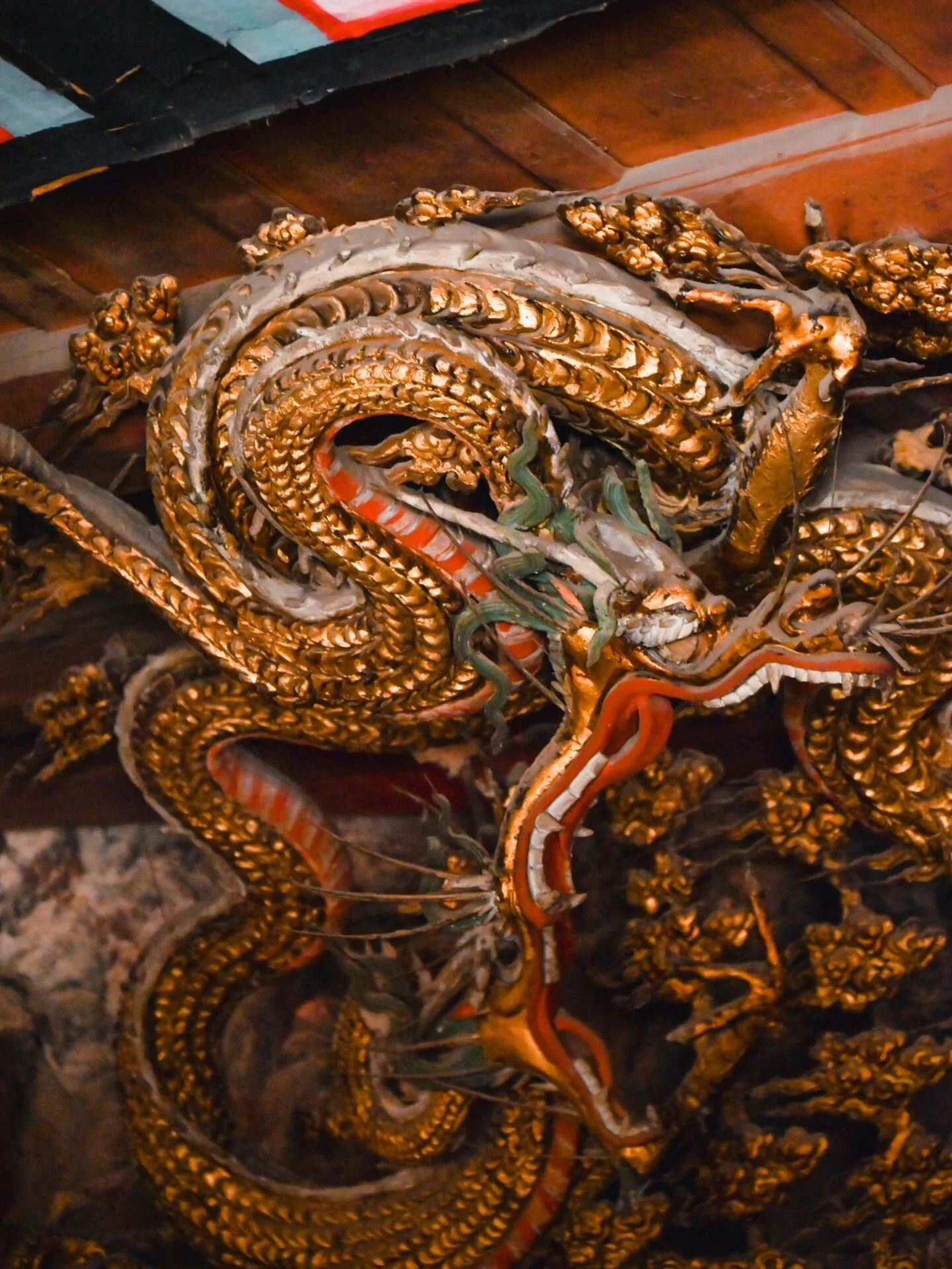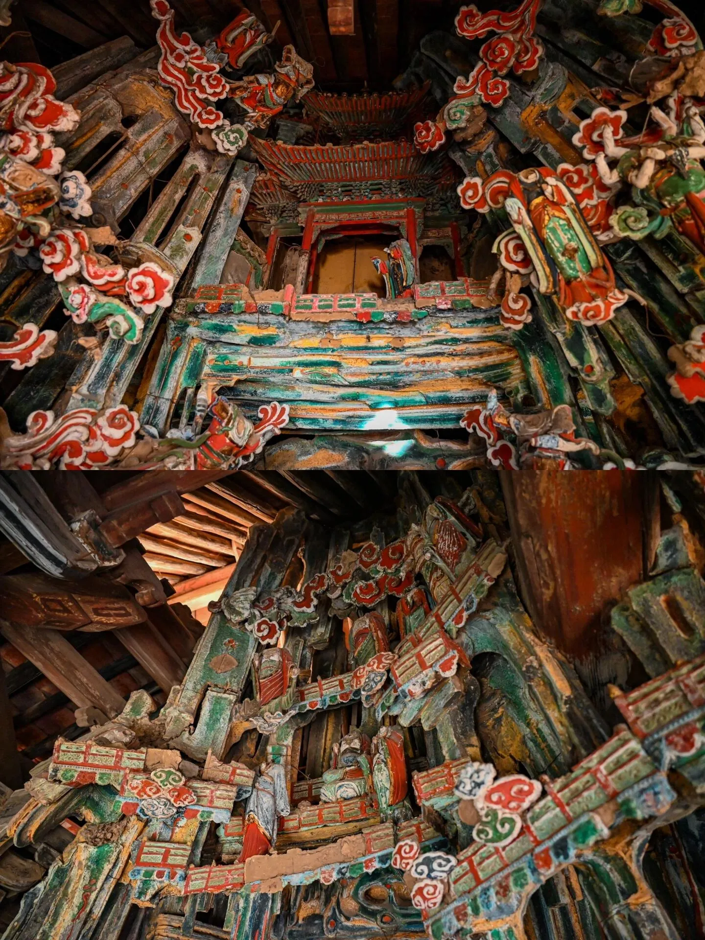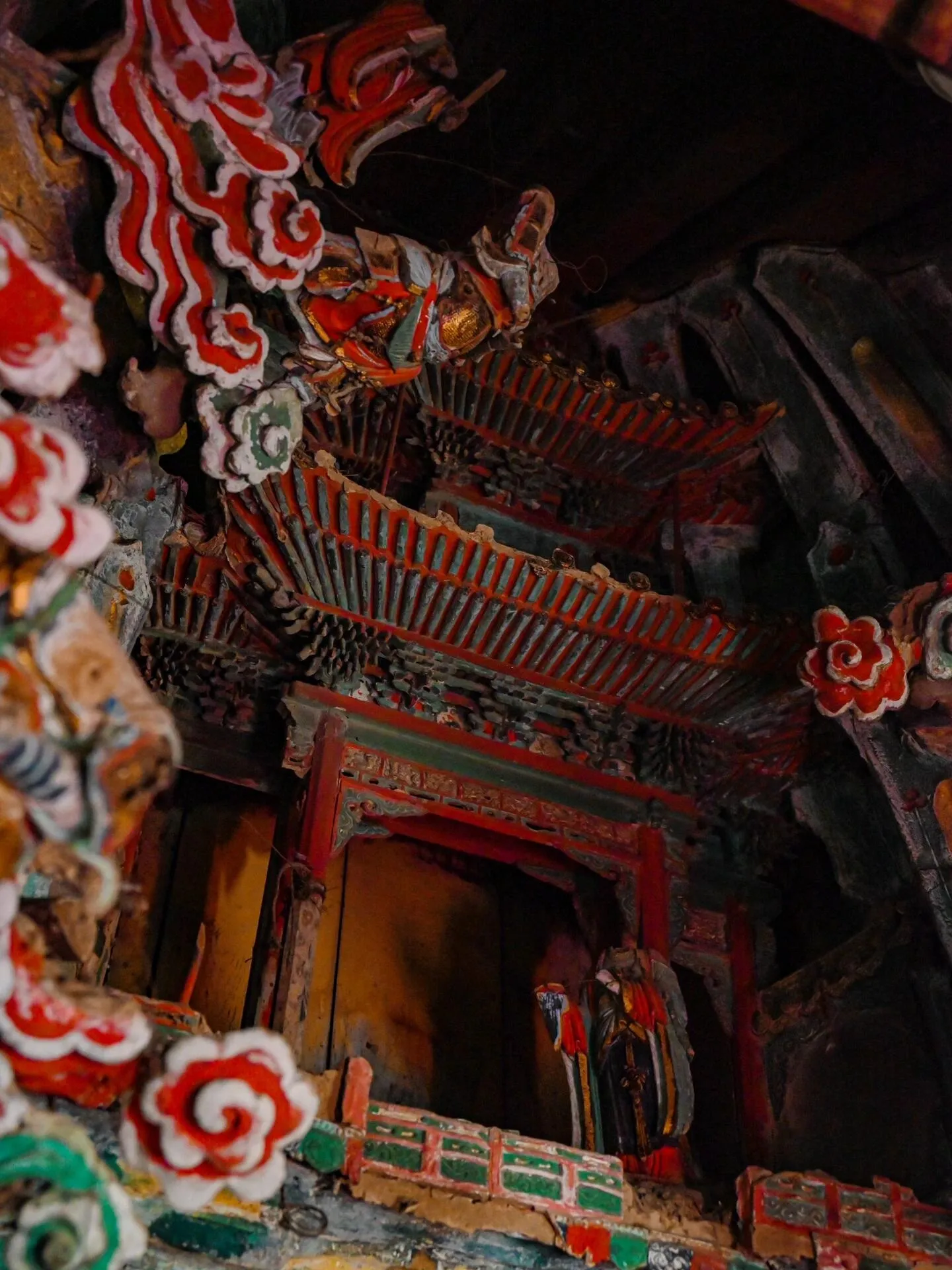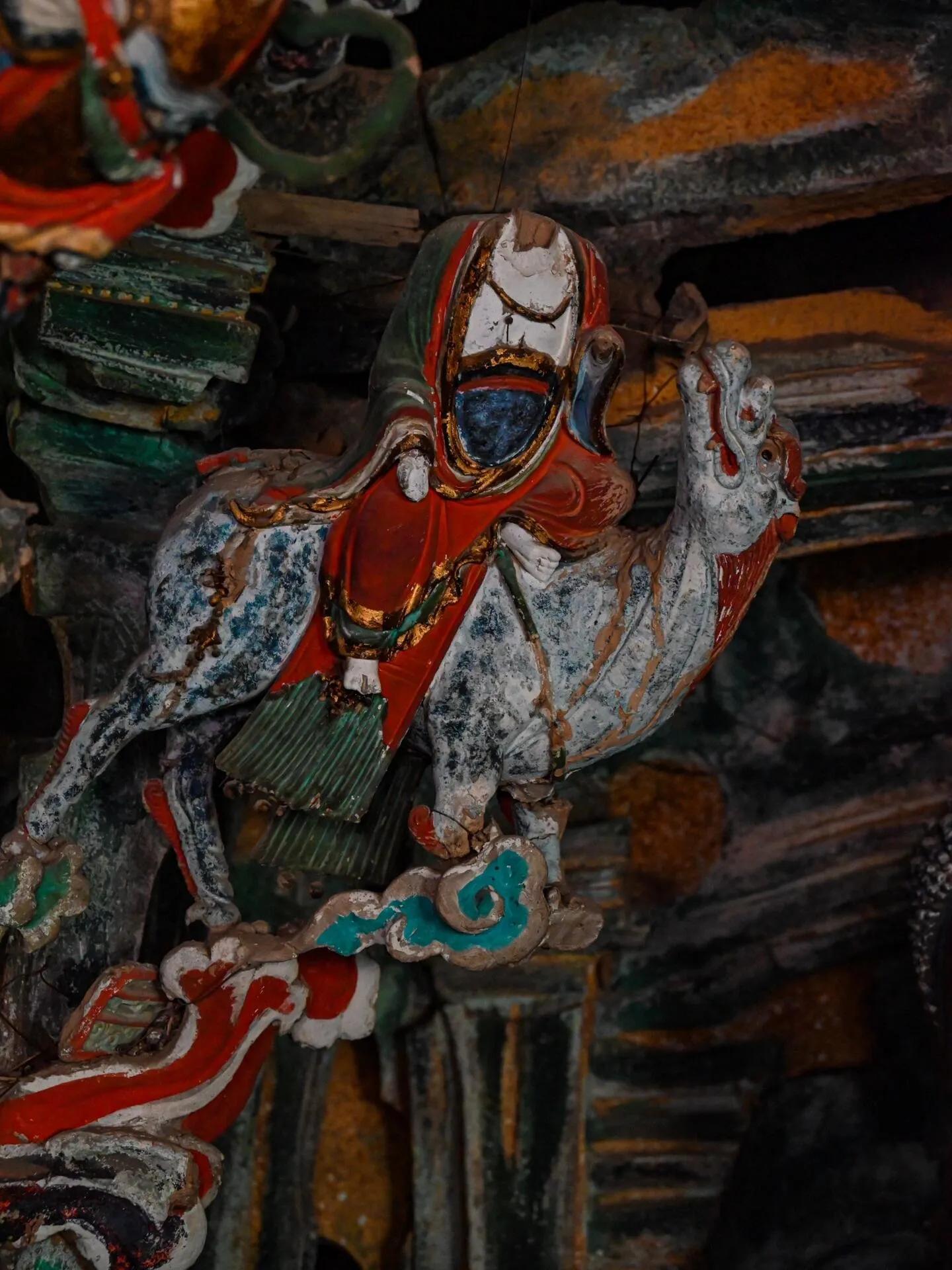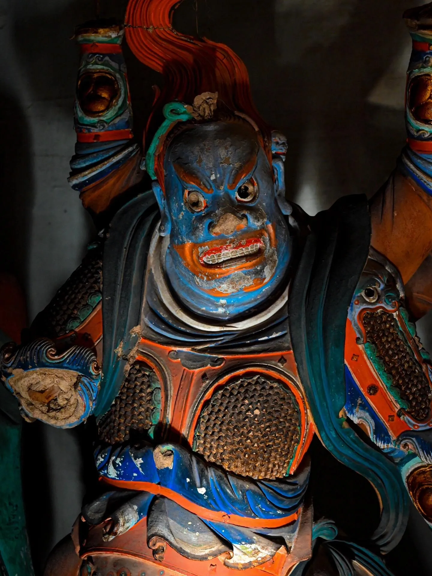 参观悬空寺时,除了惊叹于建筑的精巧和奇险,各个殿宇里的彩塑和悬塑同样值得关注。雷音殿位于南楼的最高层,供奉华严三圣,周围布满悬塑,包括亭台阁楼、24位飞天和18罗汉。可惜的是,大部分悬塑头部已经残缺。