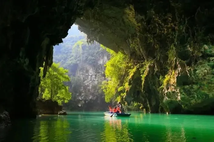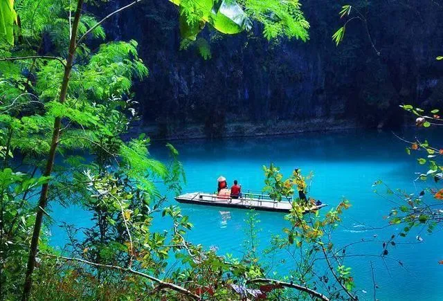 这里是典型的喀斯特地貌,游人坐船穿梭在岩洞中,当穿过密林,邂逅一片蓝得耀眼的水面,大概除了惊叹,别无其他感受。