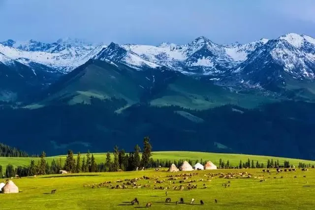 四月和五月是伊犁河谷最美的时节,蓝天、白云、雪山、草原、鲜花...每一帧都如同画卷一般。