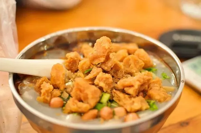 米糊上撒馓子、花生碎、黄豆、大头菜等,再加盐、辣椒油、葱花,搅拌后食用,香气扑鼻,美味无比。
