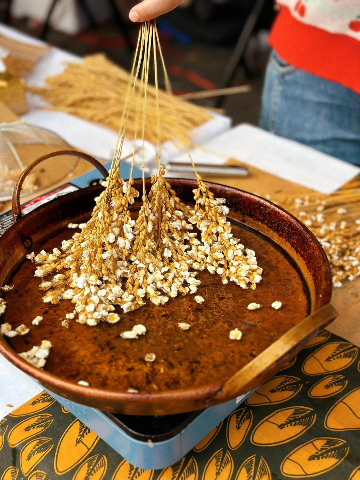 市集上有来自各地的自创美食,包括村里阿姨卖的臭豆腐、手艺人的吹糖和糖画、自家养的土蜂蜜,还有各种炸物小吃。除了美食,市集还有定时表演。我去的那天恰好有非洲鼓表演,周围的人随着音乐和鼓点自由跳舞,氛围十分热烈。