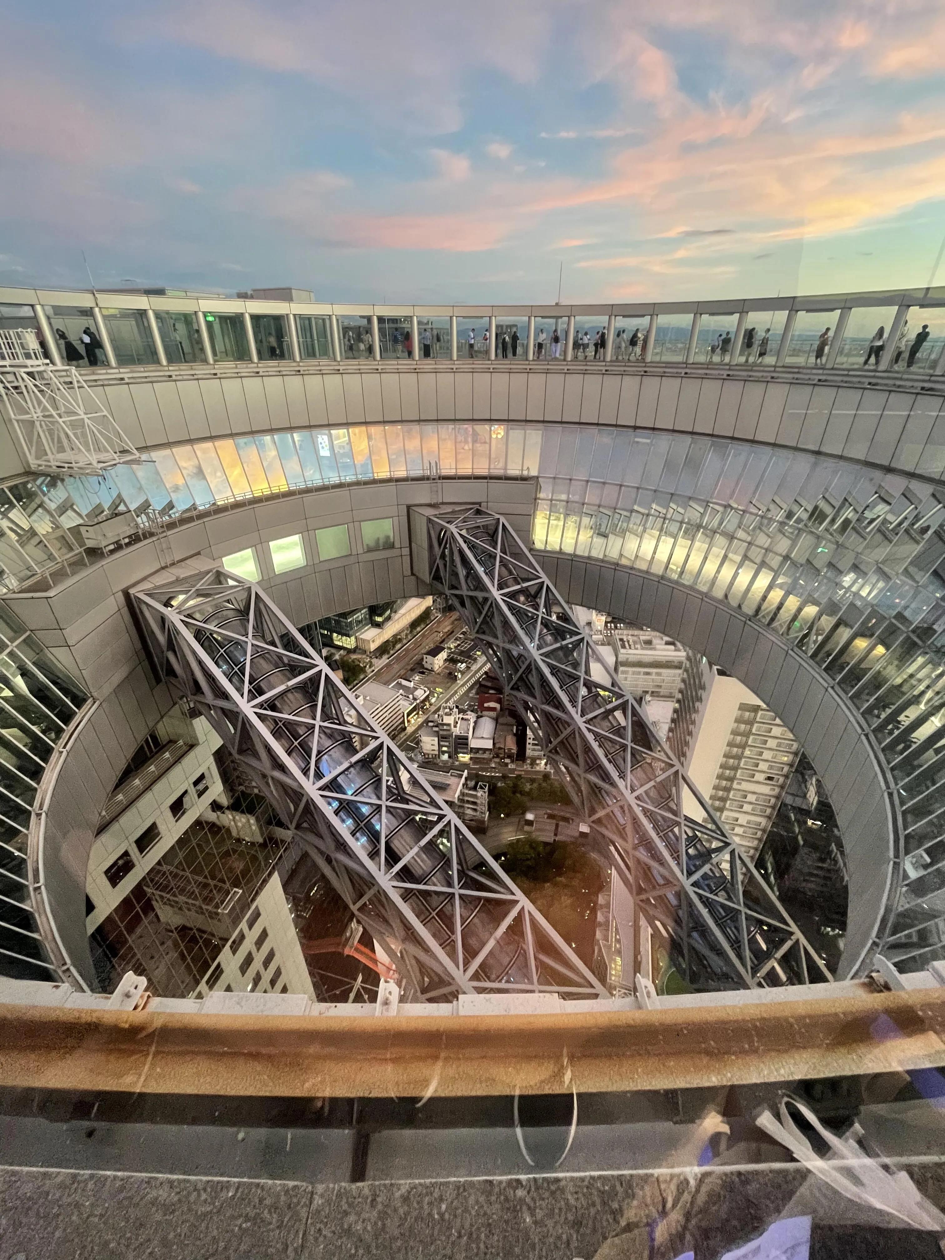 在大阪梅田站附近,有一处鲜为人知的绝佳观景台——蓝天大厦。从梅田站步行约10分钟即可到达。抵达后,乘坐扶梯到三楼,再换乘电梯上到35楼购票。门票价格为每人2000日元。