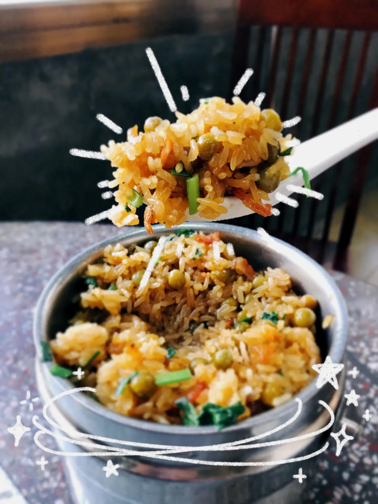这里还有一道特色主食——糯米饭。装在铝制饭桶里,分量十足,一小碗就能让人饱腹。