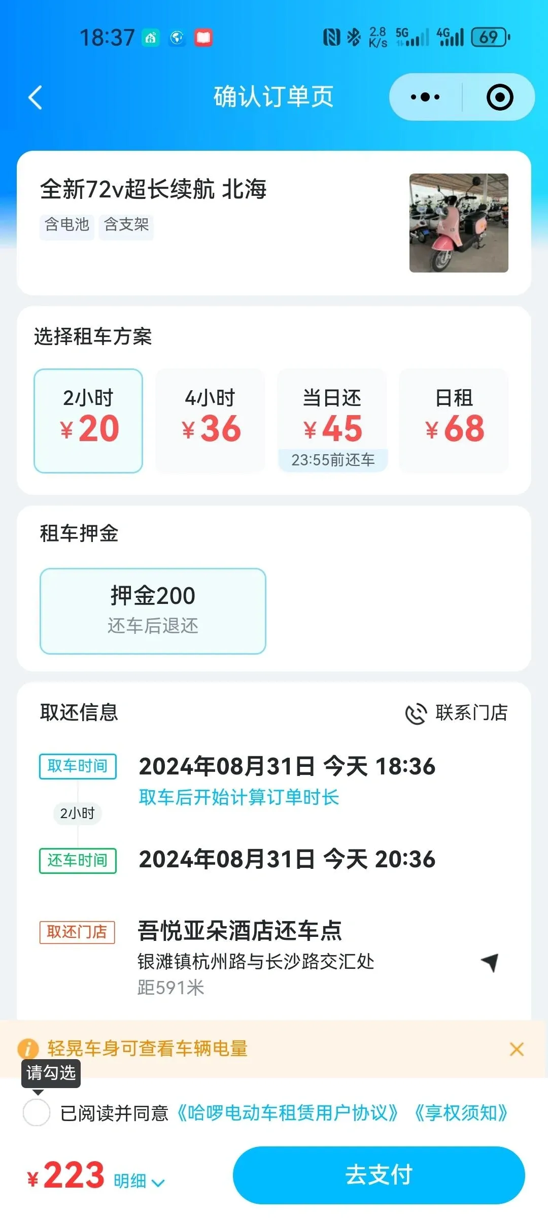 在北海, 哈啰租车平台提供了便捷的电动车租赁服务。 游客可以通过扫码方式租车, 价格透明,日租45元,另加5.5元保险费,押金200元。 这些新车电量充足,一天的行程后仍有剩余电量。值得一提的是, 这些电动车还配备了变速功能,最高速度可达48码。
