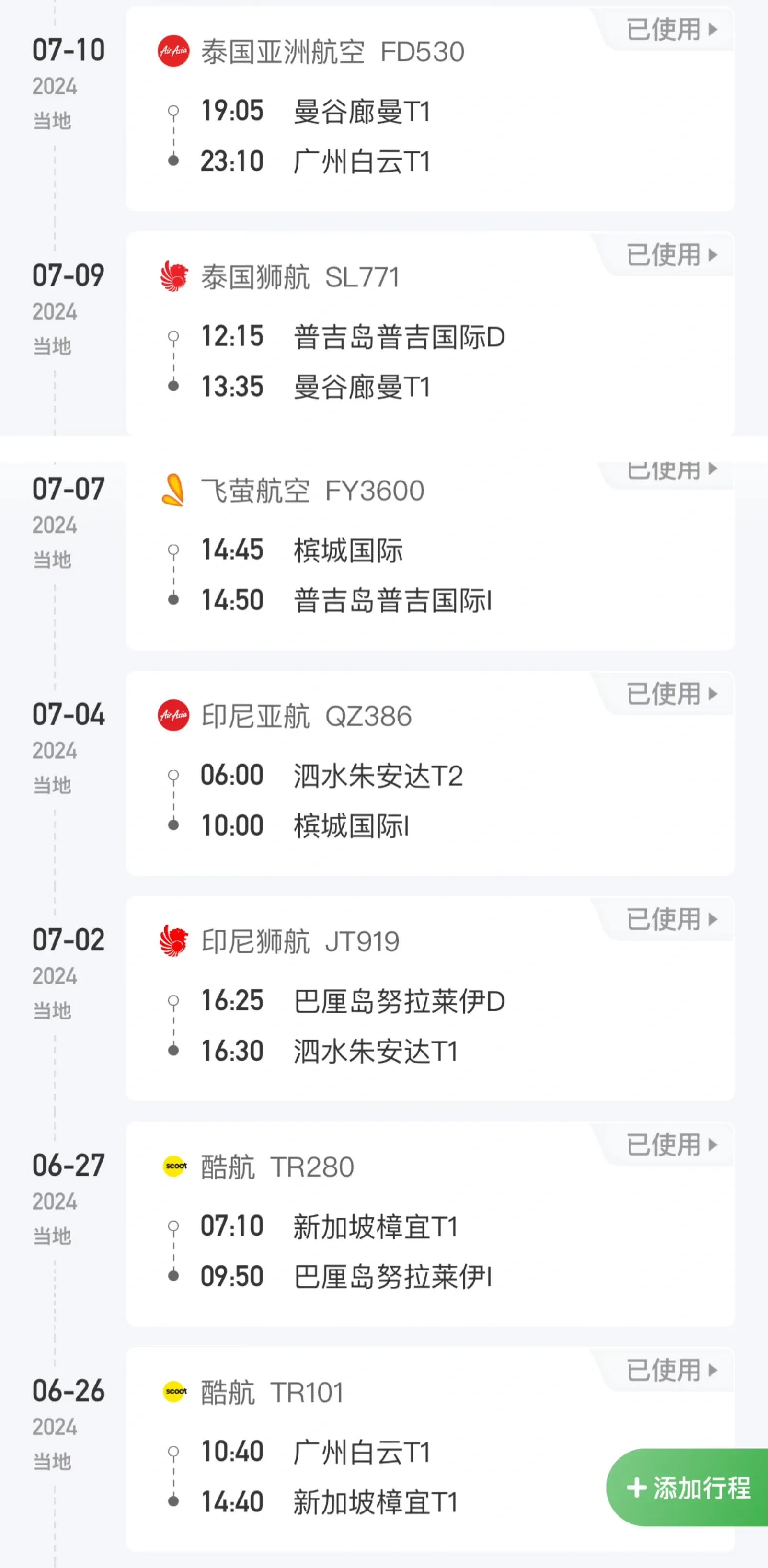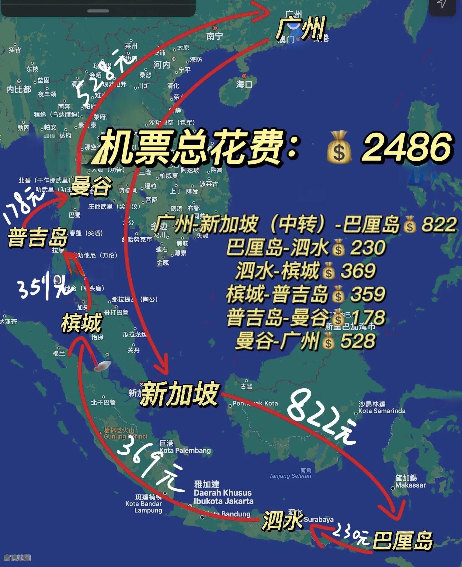 以下是一个15天环游东南亚的实际机票花费案例,总计2486元,包含7趟航班: