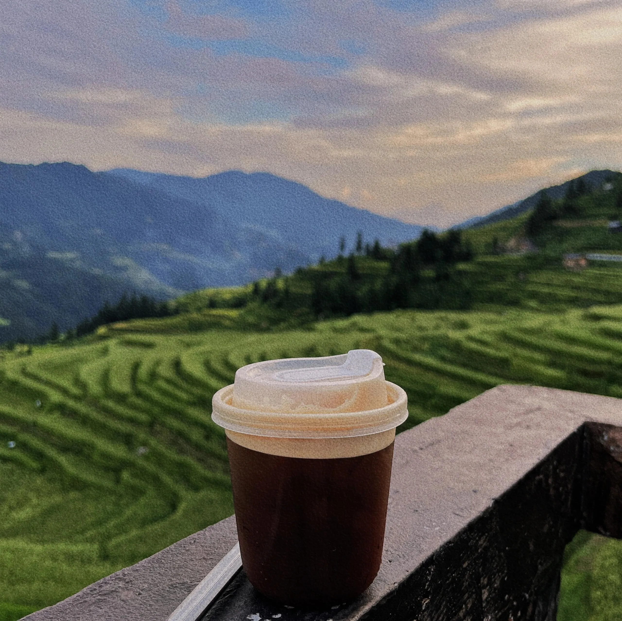 第二天早餐后前往堂安梯田。在侗寨主街上有多家售卖车票的商家,选择了商务车。盘山公路虽然有些绕,但沿途风景优美。到达顶部寨子后,壮观的梯田景观令人叹为观止。 在一家两层楼的甜品店小憩 ,这里也是个不错的拍照点。