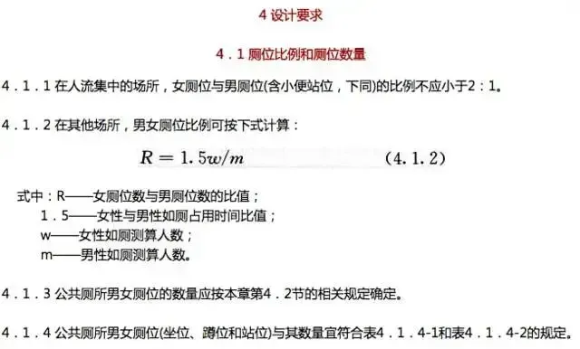 2016年12月起,中国住房和城乡建设部发布了新版《城市公共厕所设计标准》,将人流密集场所的女性厕位与男性厕位的比例调整为2:1或更大。