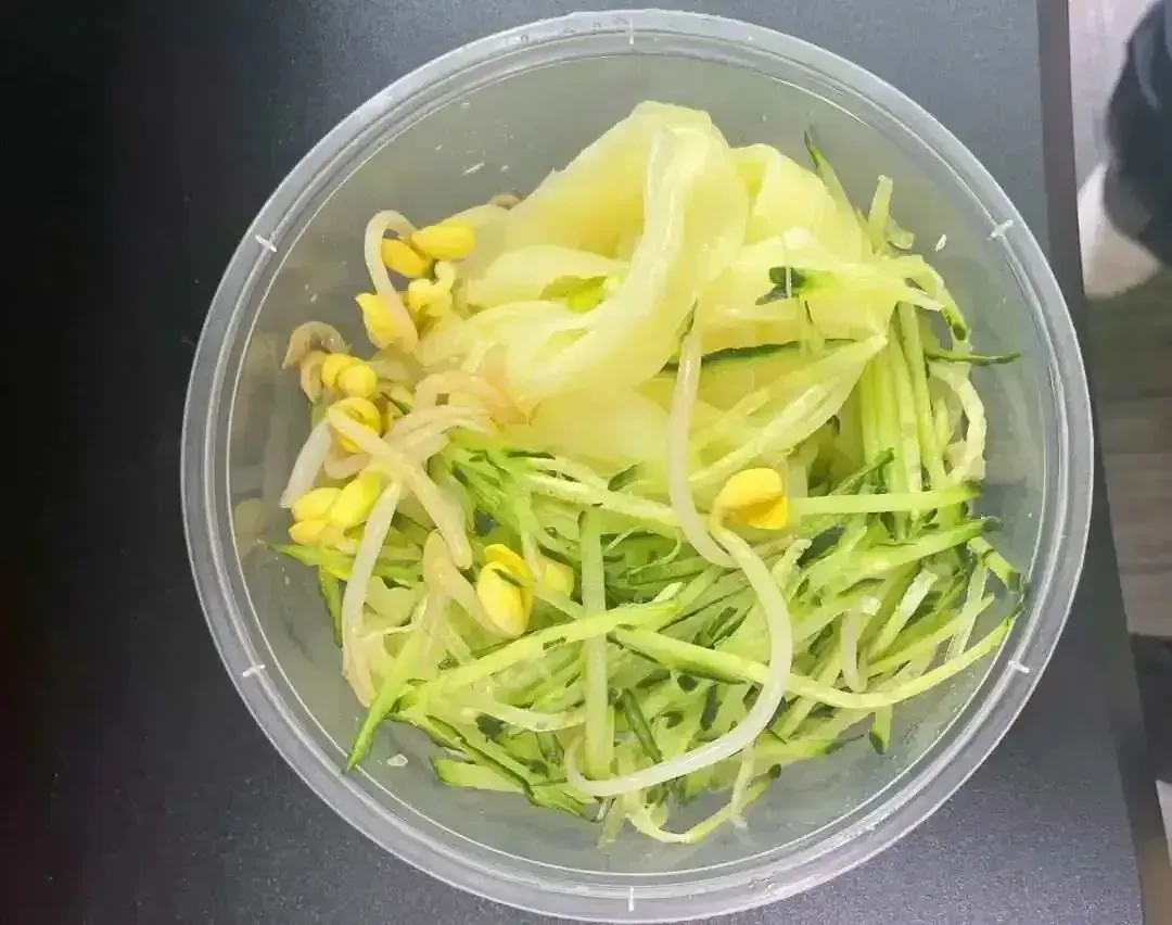 另一例更常见外卖配菜只有50克的黄豆芽和20克的黄瓜丝,营养价值显然不够,最多只能提供5-6毫克的维生素C,和大约1克的膳食纤维,其他矿物质含量极为有限,无法满足营养的基本标准。