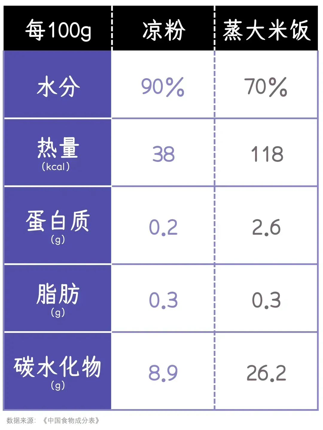 根据《中国食物成分表》,凉粉的碳水化合物含量只有9%,而90%为水分, 热量仅为38kcal