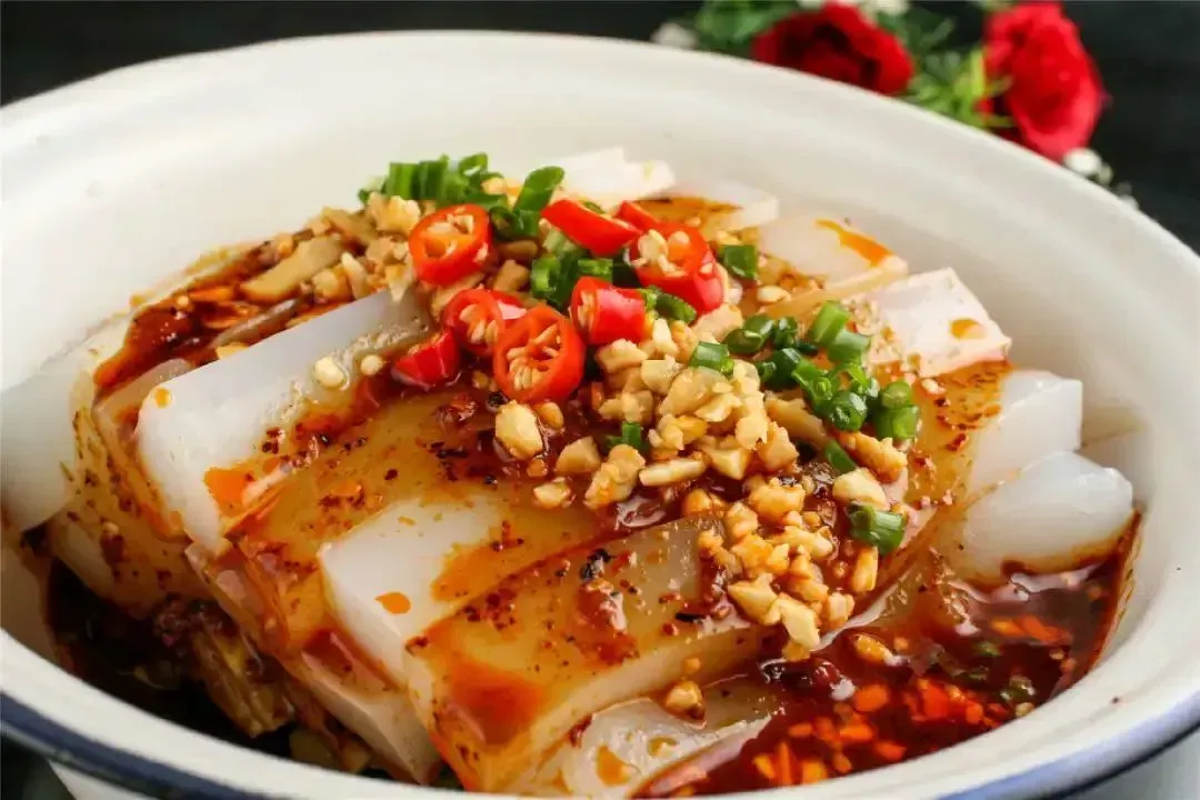 冷却完成后便可食用,这就是凉皮(小麦淀粉制成的)、凉粉(多用豌豆淀粉等制作)、凉鱼等。