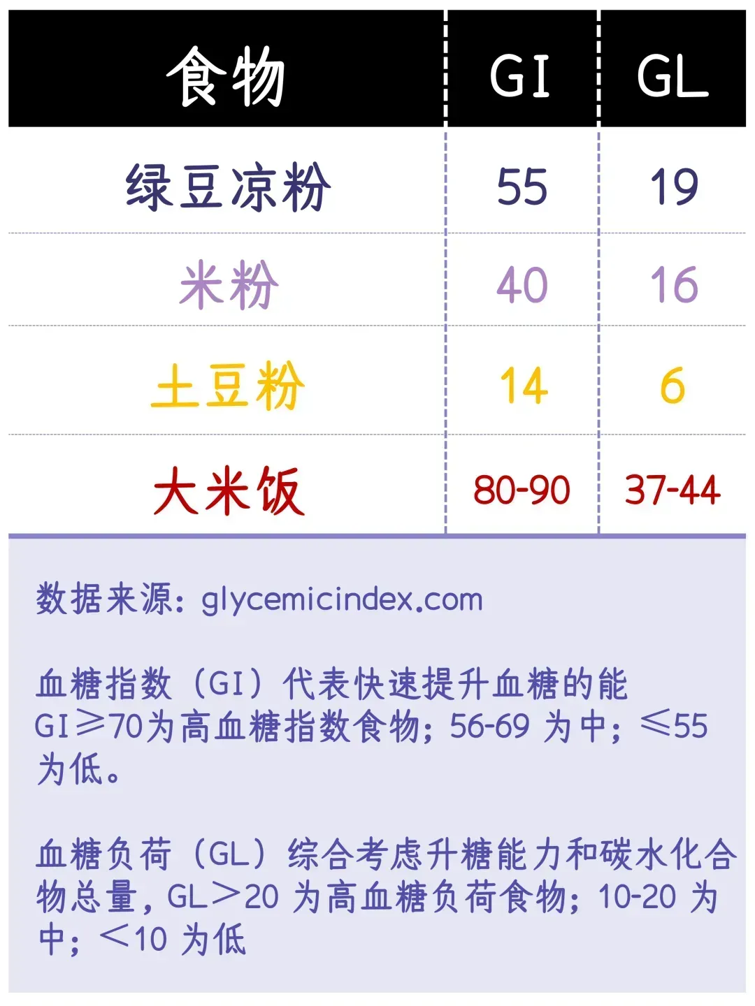 由于含干货少及抗性淀粉多,这些主食的血糖指数(GI)与血糖负荷(GL)均低于米饭: