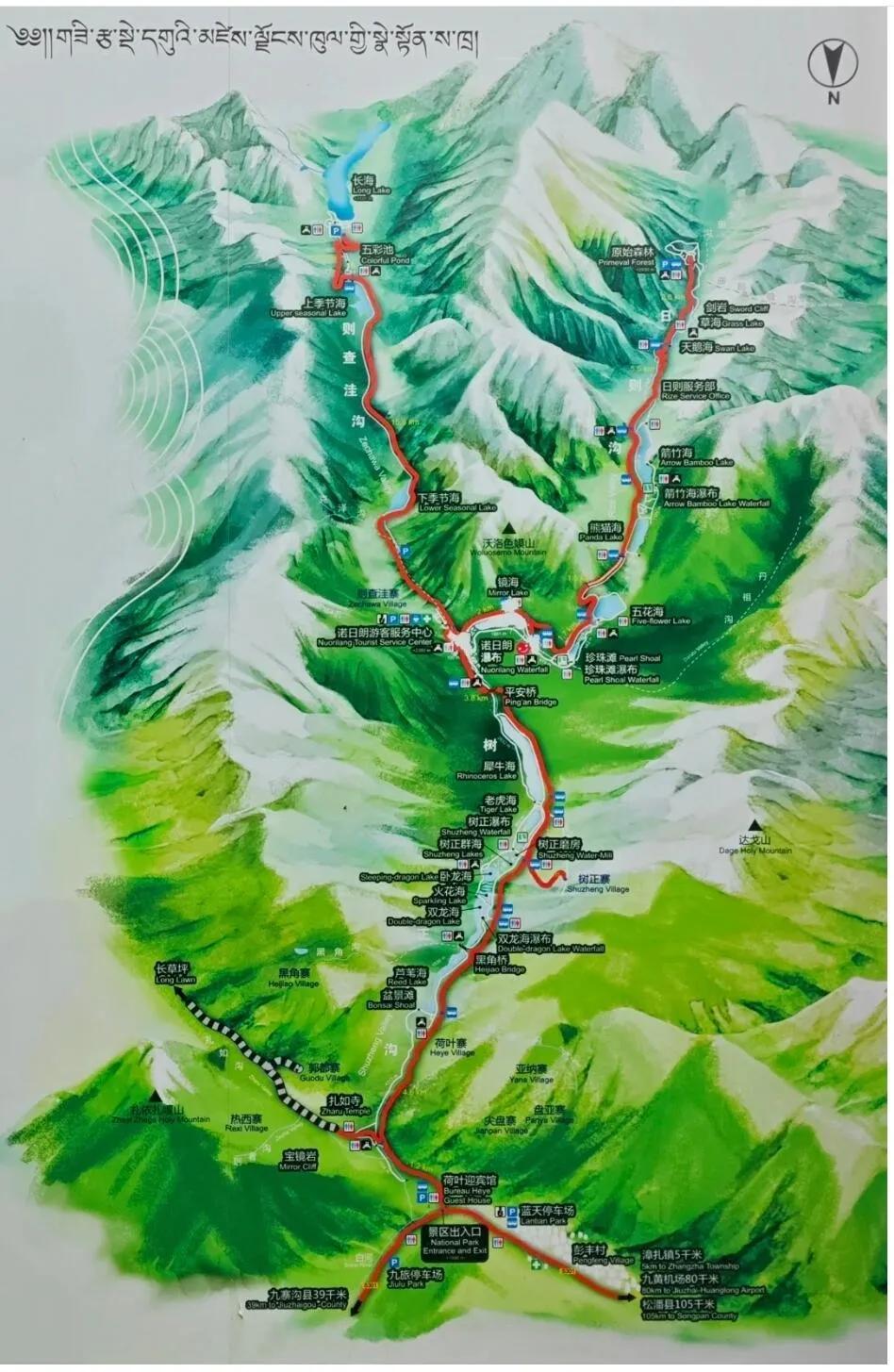 游客中心--长海(乘车)--五彩池--上季节海--下季节海(乘车)--诺日朗中心(乘车)--原始森林--剑岩悬泉--芳草海--天鹅海--箭竹海--箭竹海瀑布--熊猫海--熊猫海瀑布--五花海--金铃海--珍珠滩--珍珠滩瀑布--镜海--诺日朗中心(乘车)--诺日朗瀑布--犀牛海--老虎海--树正瀑布--树正磨房--树正群海--卧龙海--火花海--双龙海--芦苇海--盆景滩--游客中心(乘车)