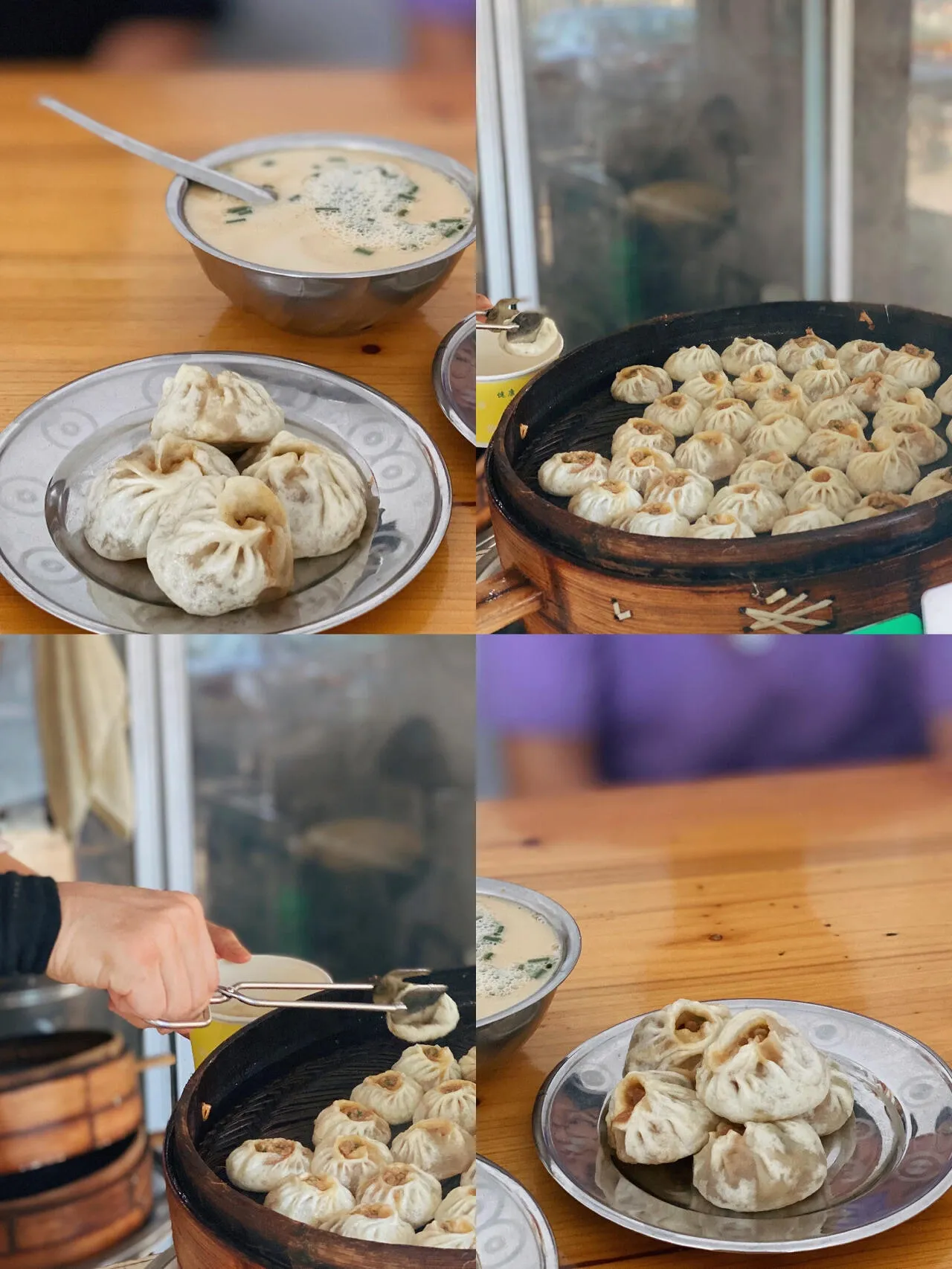 咸豆浆1元,里面有榨菜和葱,喜欢咸口的可以尝试。甜豆浆1元,底下铺了白糖,阿姨把滚烫的豆浆倒入,甜甜的很好喝。包子1.2元/个,皮薄馅多,肉质饱满。蘸上醋和辣椒,一口咬下还有肉汁,很鲜很好吃。刚出炉时热气腾腾的,一蒸笼很快就能卖光。