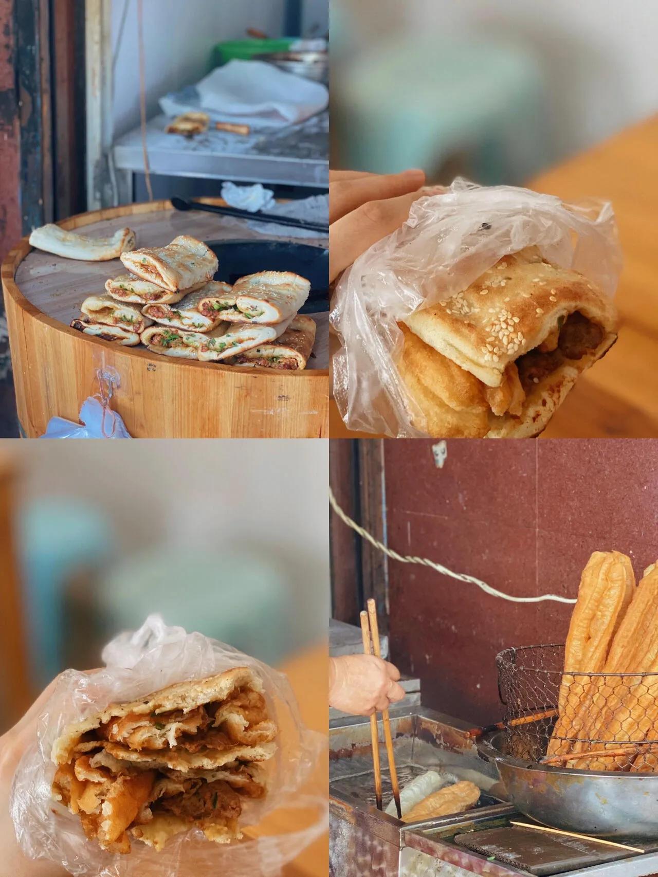 推荐肉大饼➕油条,5元。肉大饼里的料超多,肉很足,香气四溢,还有淡淡的姜味。表面撒着白芝麻,搭配上酥脆的油条,看着就让人垂涎欲滴。一个就能吃饱。肉大饼和油条都是手工现做的,可以看到他们制作大饼的过程。