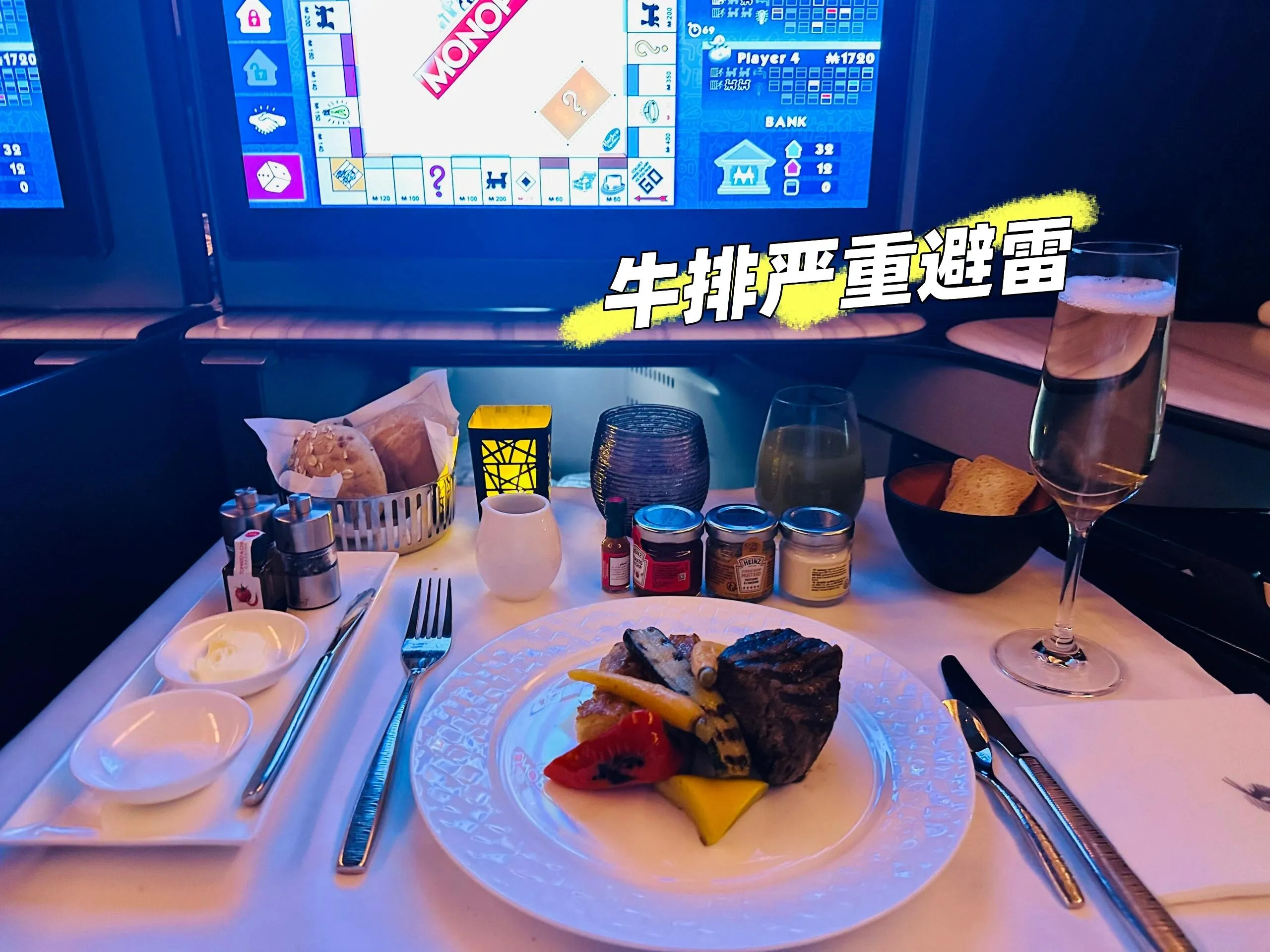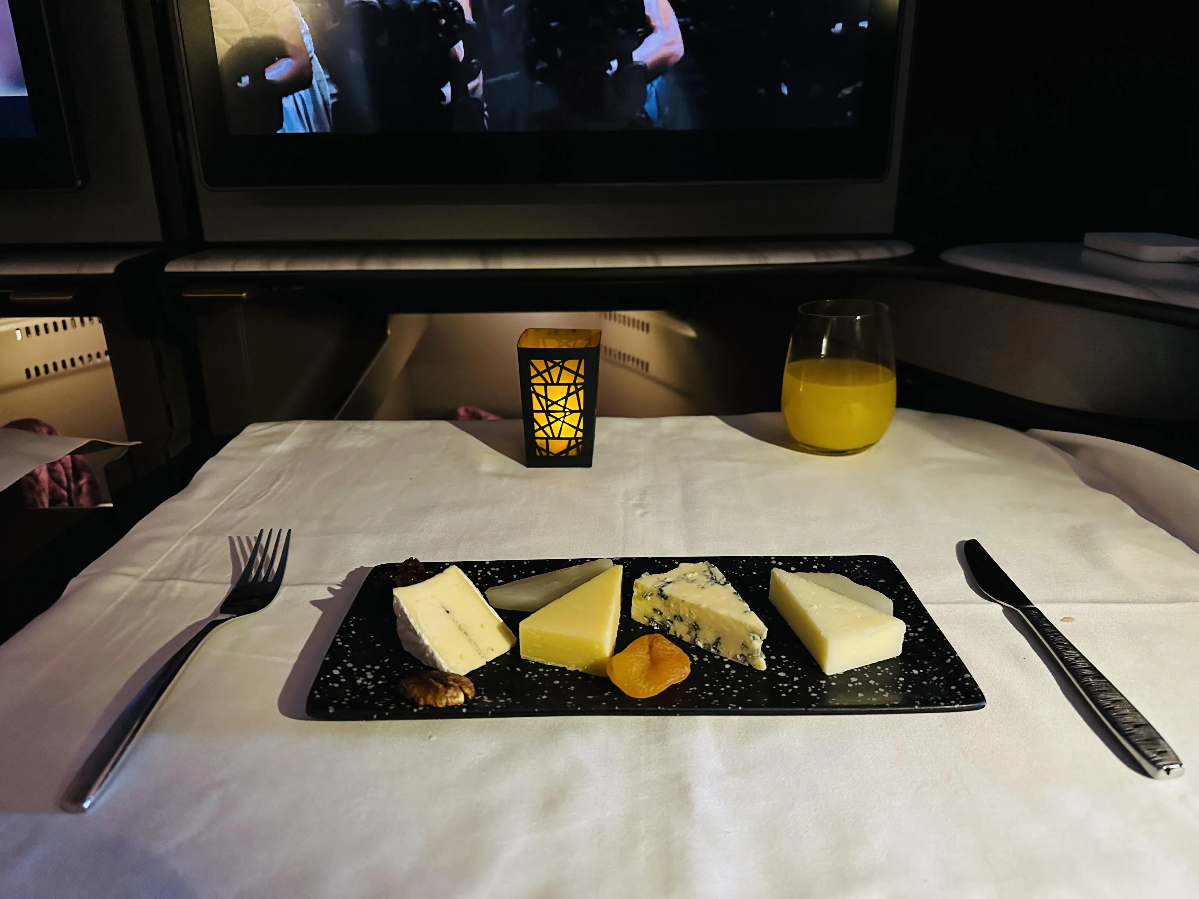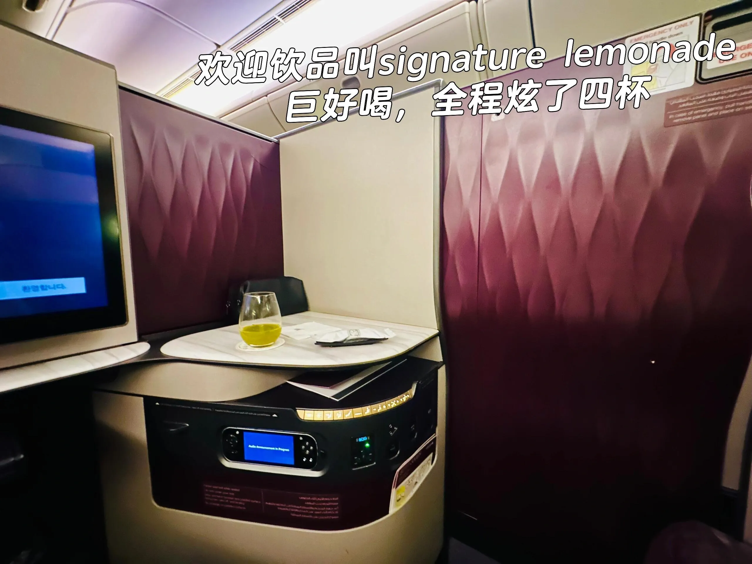 Qsuite客舱采用深粉色调,3E和3F座位可组合成双人床 ,非常适合情侣出行。洗漱用品和湿巾均为Diptyque品牌。虽然商务舱几乎满员,但服务质量并未下降。signature lemonade欢迎饮料备受好评。餐食方面, 前菜新增了鱼子酱选项,但主菜牛排口感欠佳。 酒水种类尚可,但与其他顶级航空公司相比略显不足。