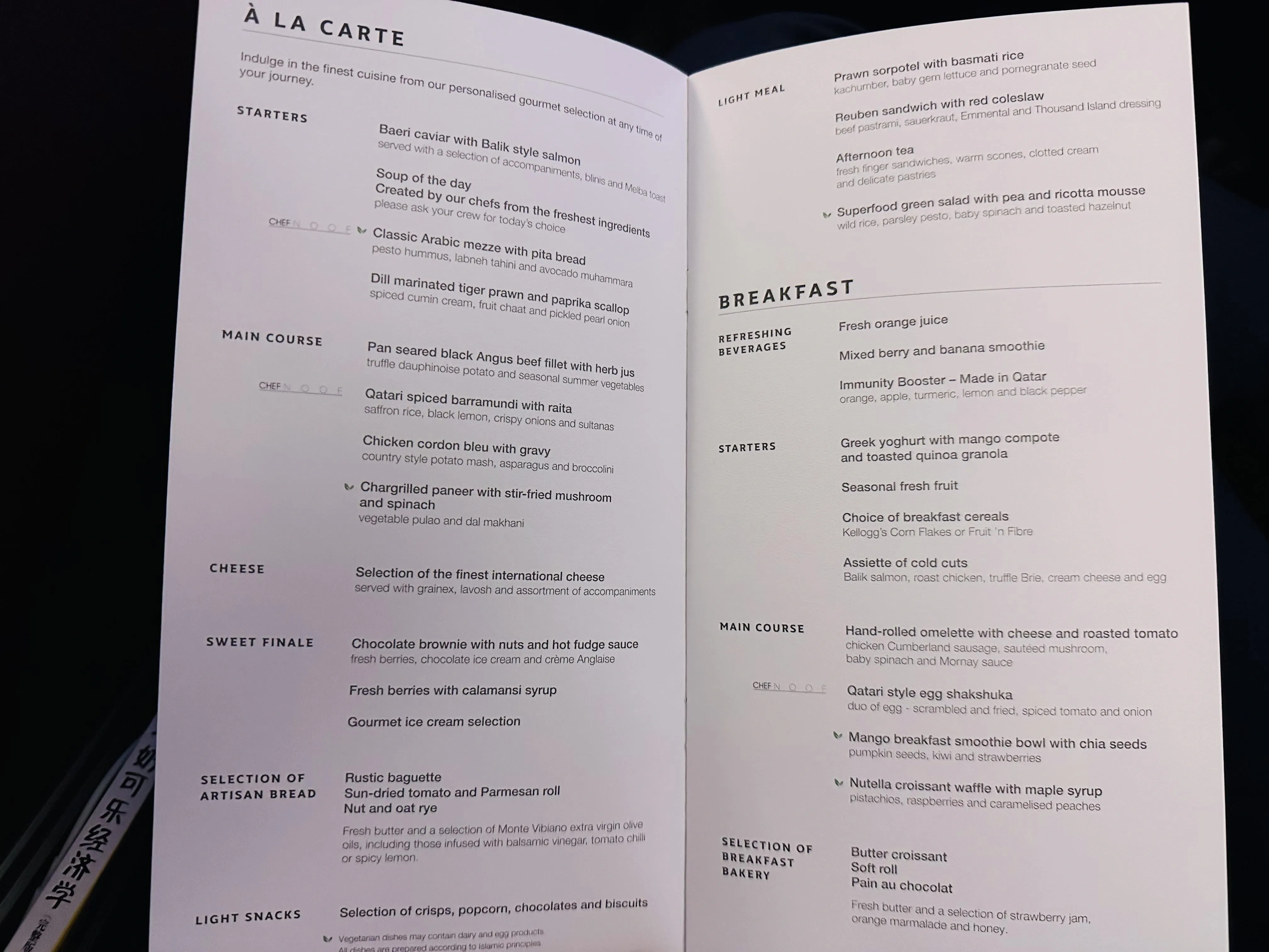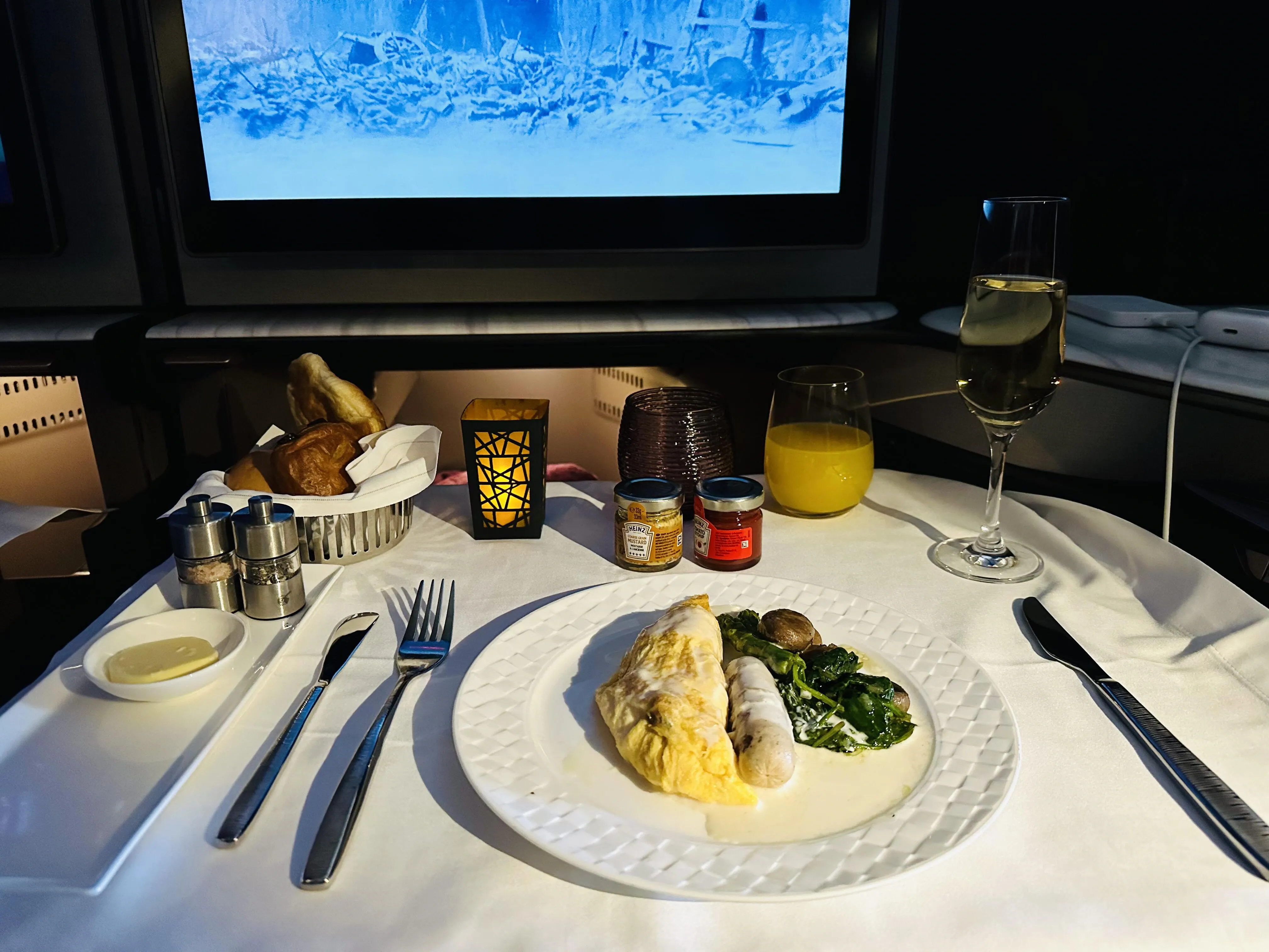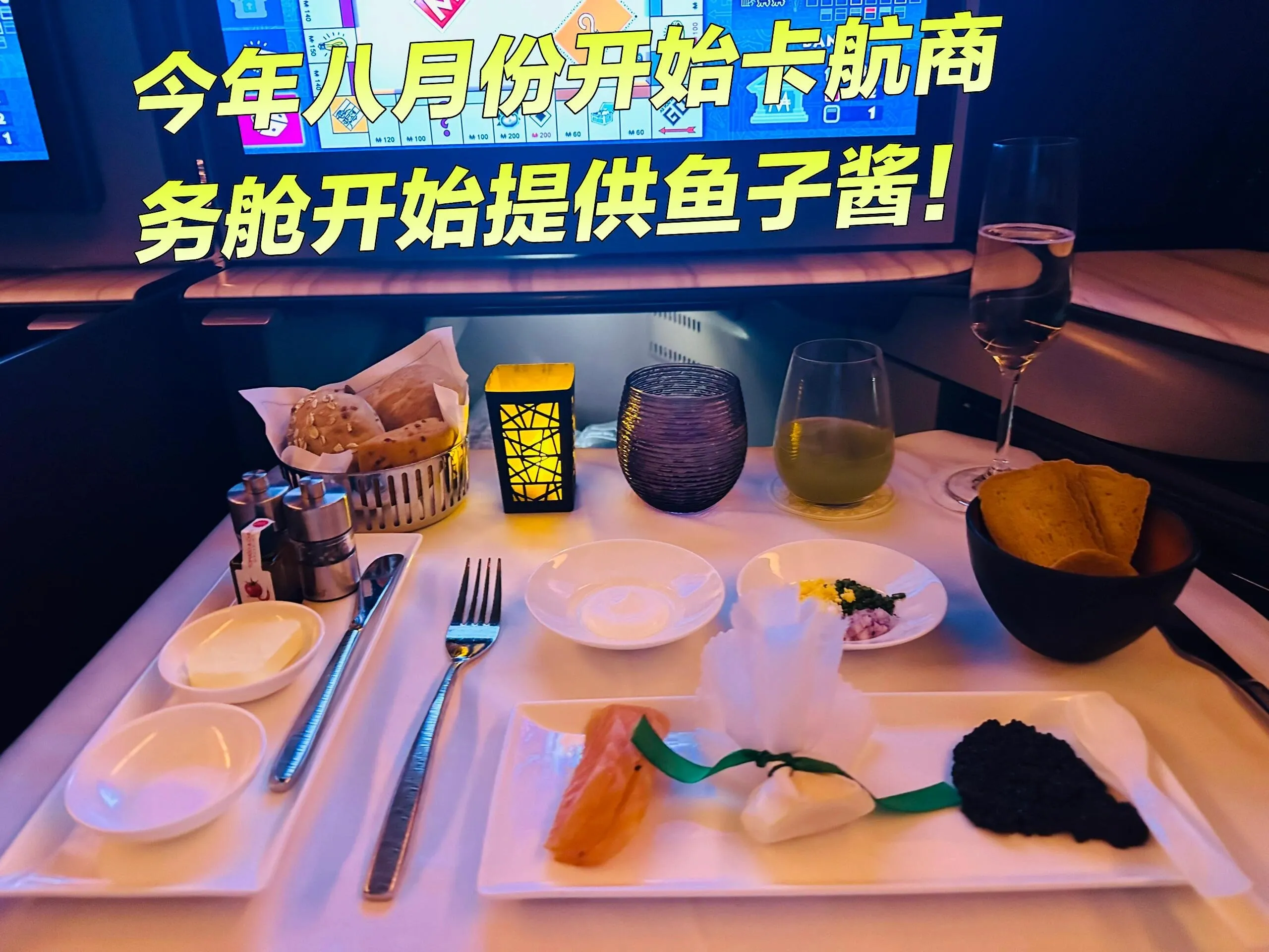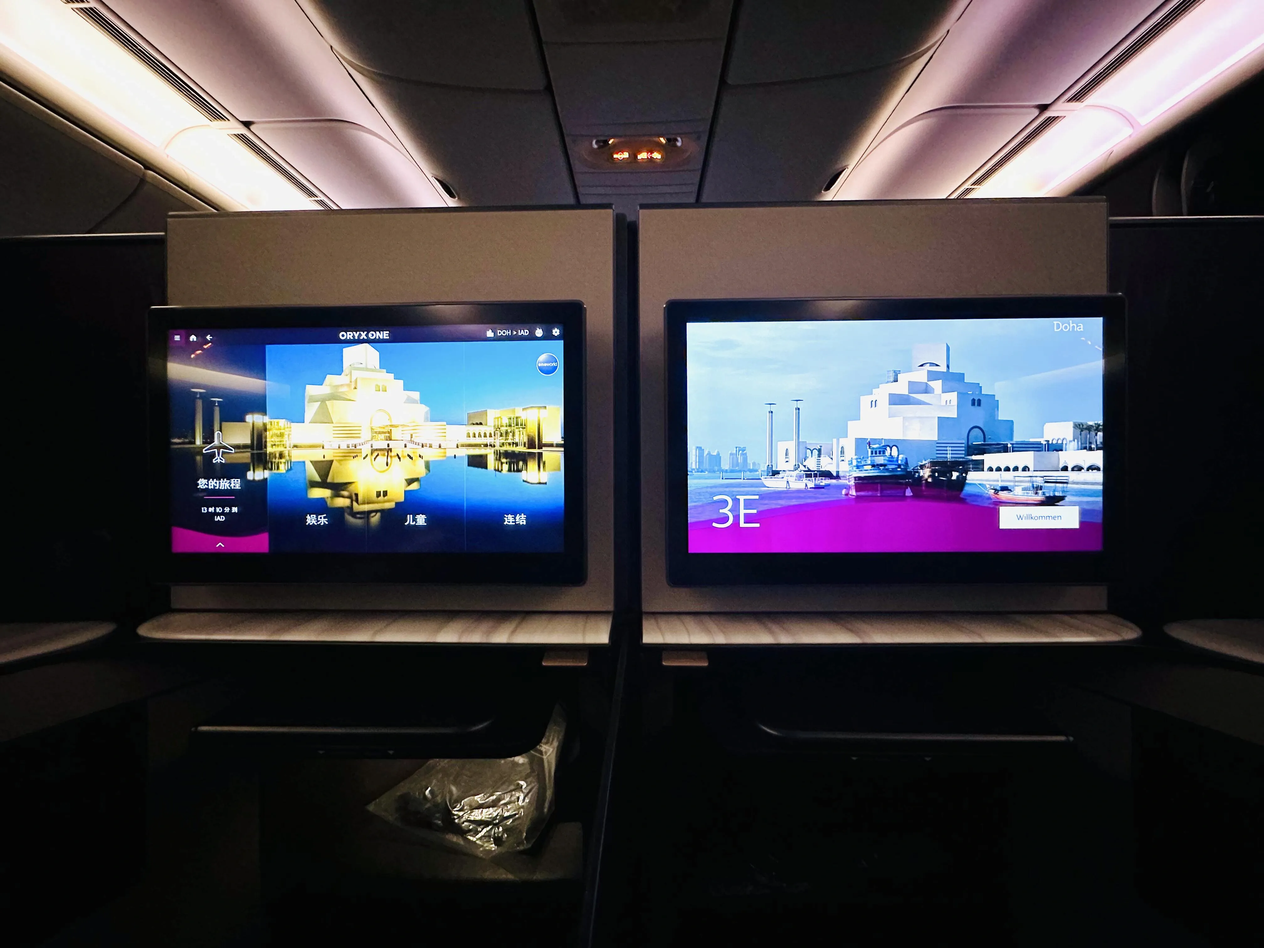 Qsuite客舱采用深粉色调,3E和3F座位可组合成双人床 ,非常适合情侣出行。洗漱用品和湿巾均为Diptyque品牌。虽然商务舱几乎满员,但服务质量并未下降。signature lemonade欢迎饮料备受好评。餐食方面, 前菜新增了鱼子酱选项,但主菜牛排口感欠佳。 酒水种类尚可,但与其他顶级航空公司相比略显不足。