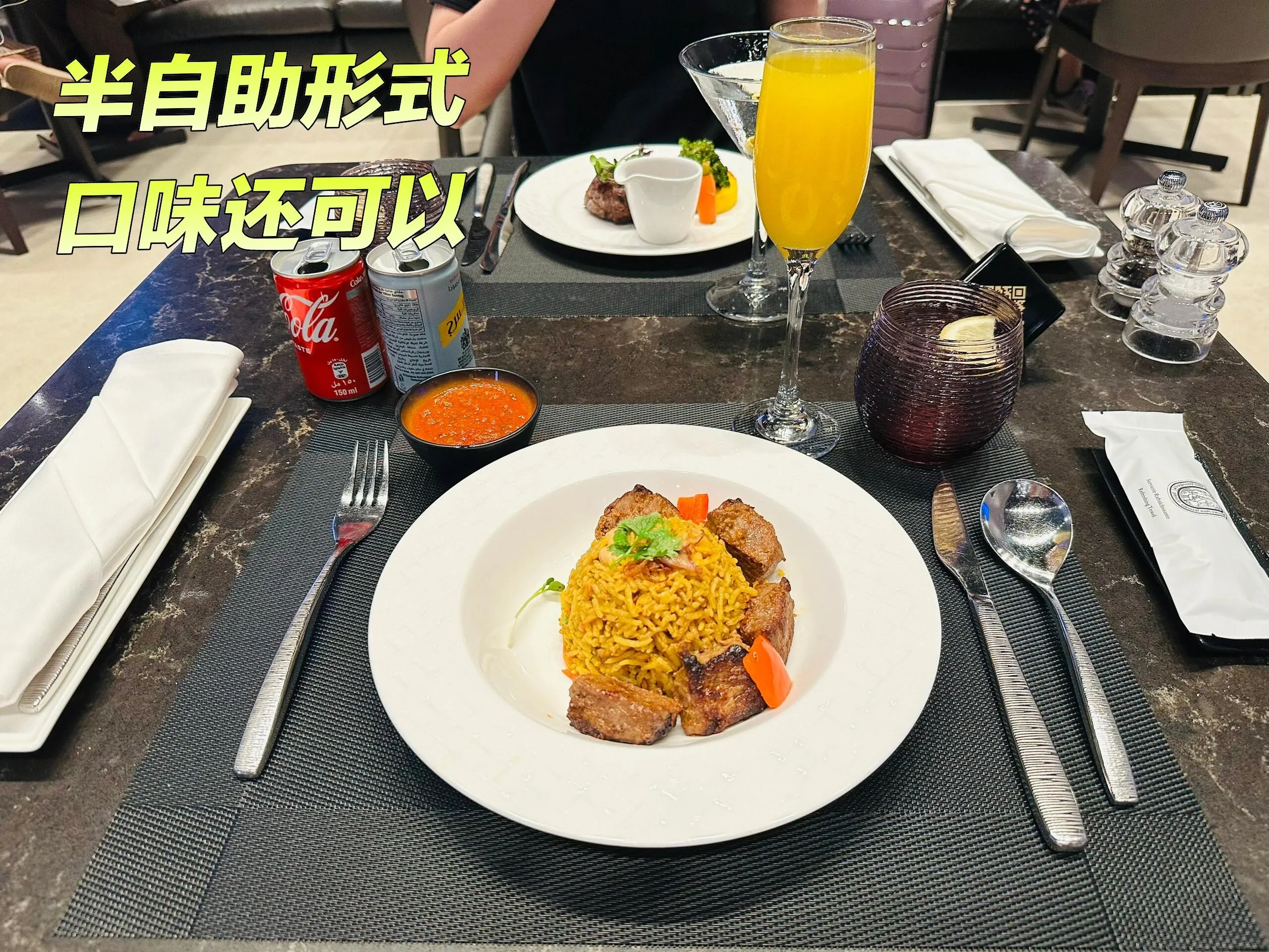 机场内的Al Mourjan Garden休息室占据整层,提供半自助餐食。lamb rice口味不错,但酒水选择与机上大致相同。值得一提的是,机场还设有LV品牌休息室,不过需要更高等级的会员资格。