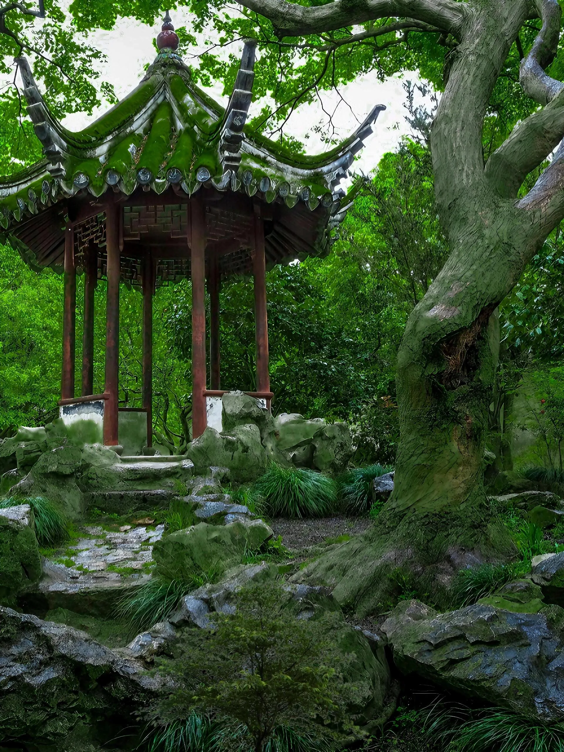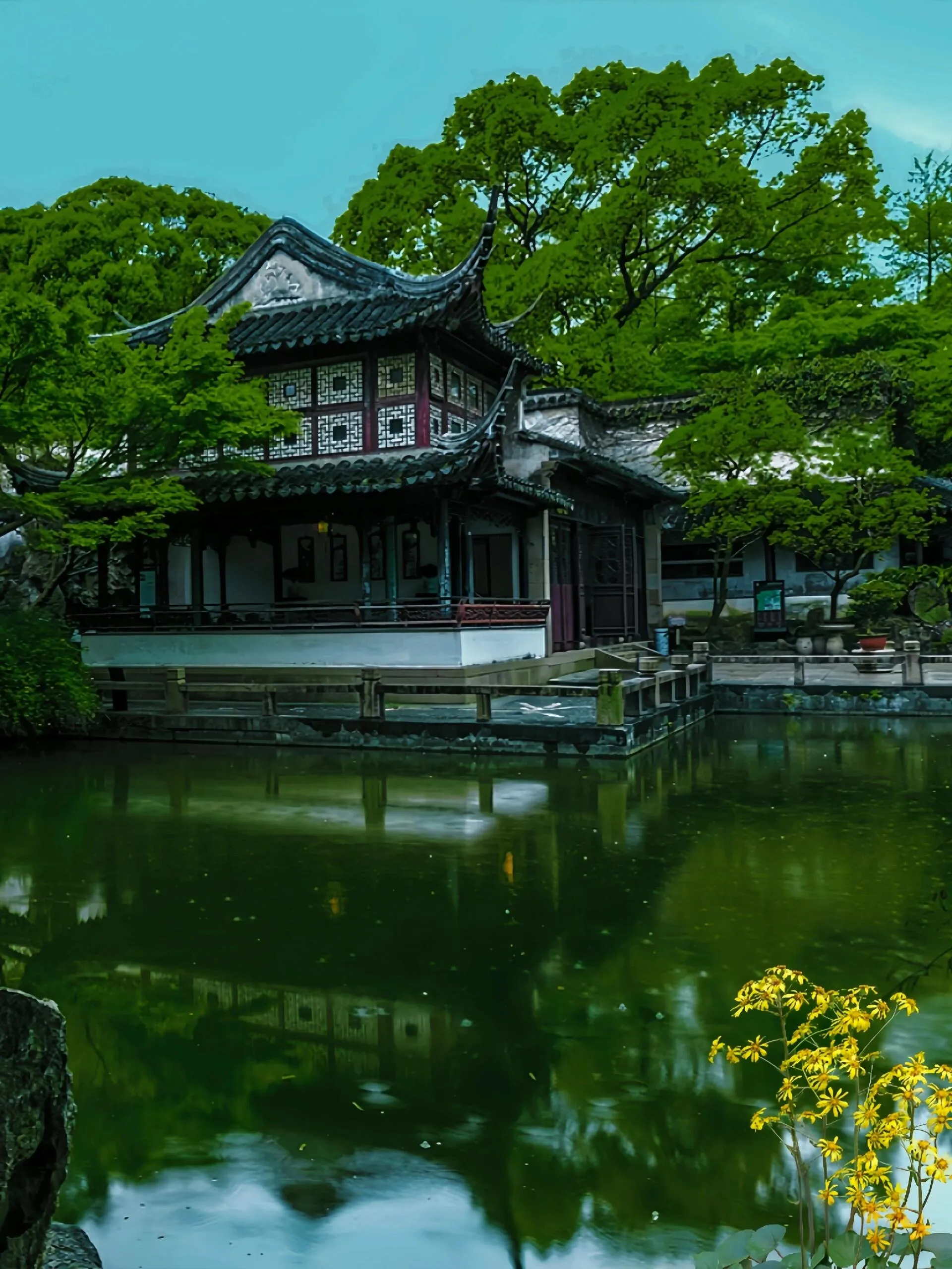 园中绿树郁郁葱葱,枝叶交织成天然的绿色穹顶。 微风穿过枝叶的缝隙轻轻拂来,带来丝丝凉意。 池塘边的水榭亭台,倒映着蓝天白云,宛如人间仙境 ,让人身心舒畅,燥热瞬间消散无踪。