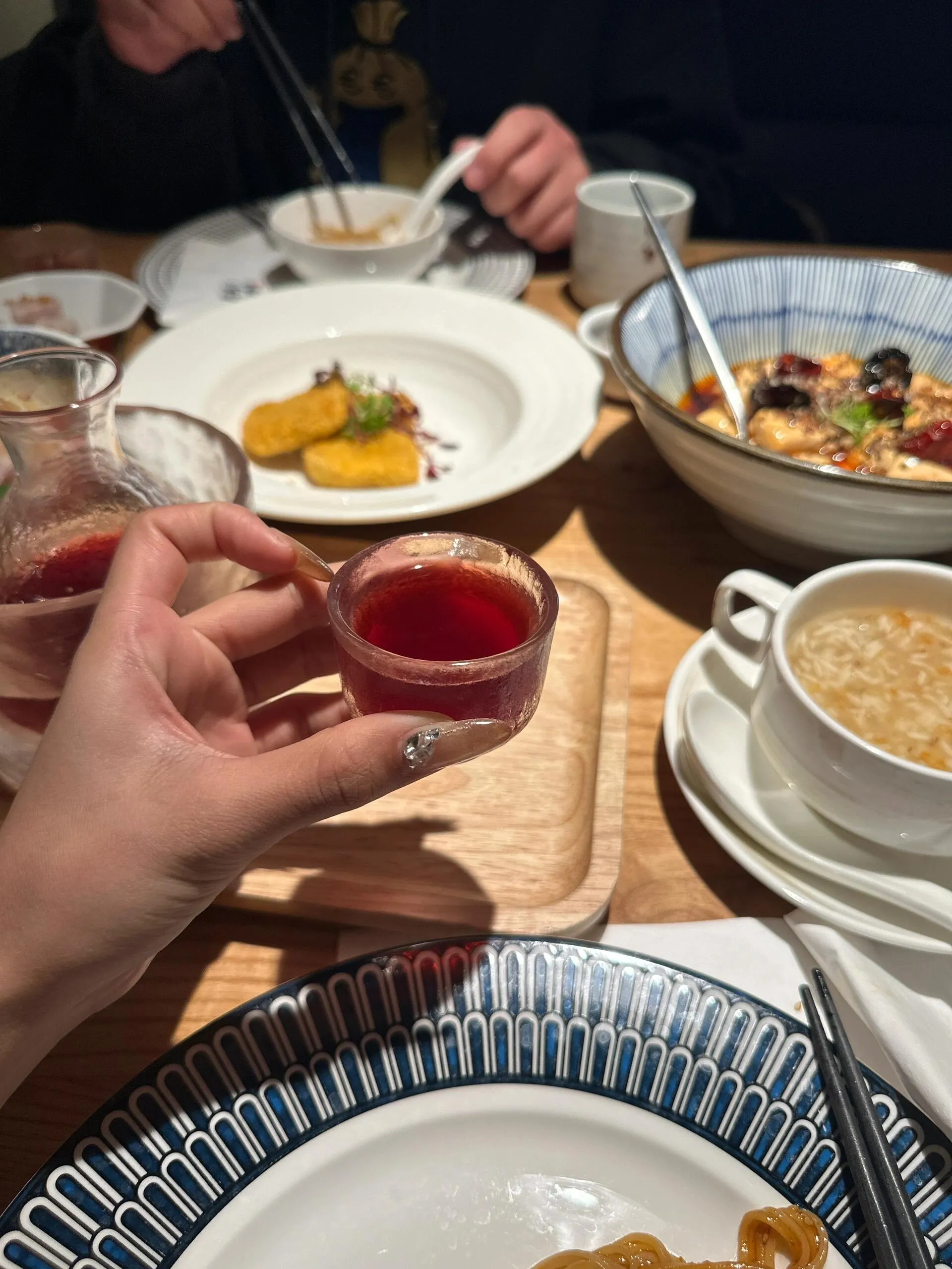 我和朋友三人一起前往,点了七八个菜品,总价才一百多元,性价比很高。店家还贴心地赠送了酸梅茶,用玻璃碗和干冰呈现,仙气飘飘,颇具视觉效果。